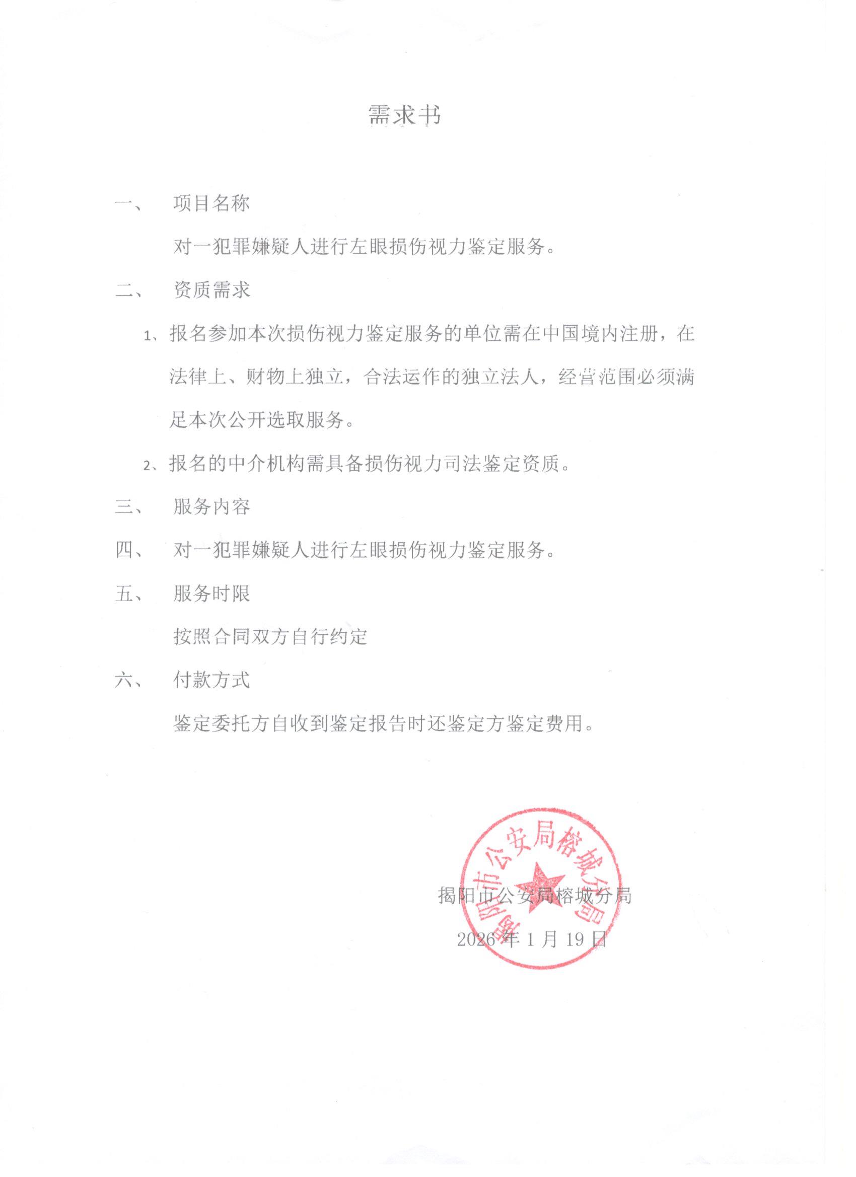 对一犯罪嫌疑人进行左眼损伤视力鉴定服务采购公告