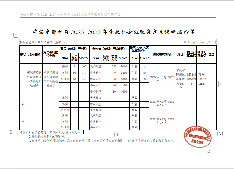 宁波南苑投资发展有限公司南苑新城酒店入围宁波市鄞州区2026-2027年党政机关会议定点场所框架协议采购项目的结果公告