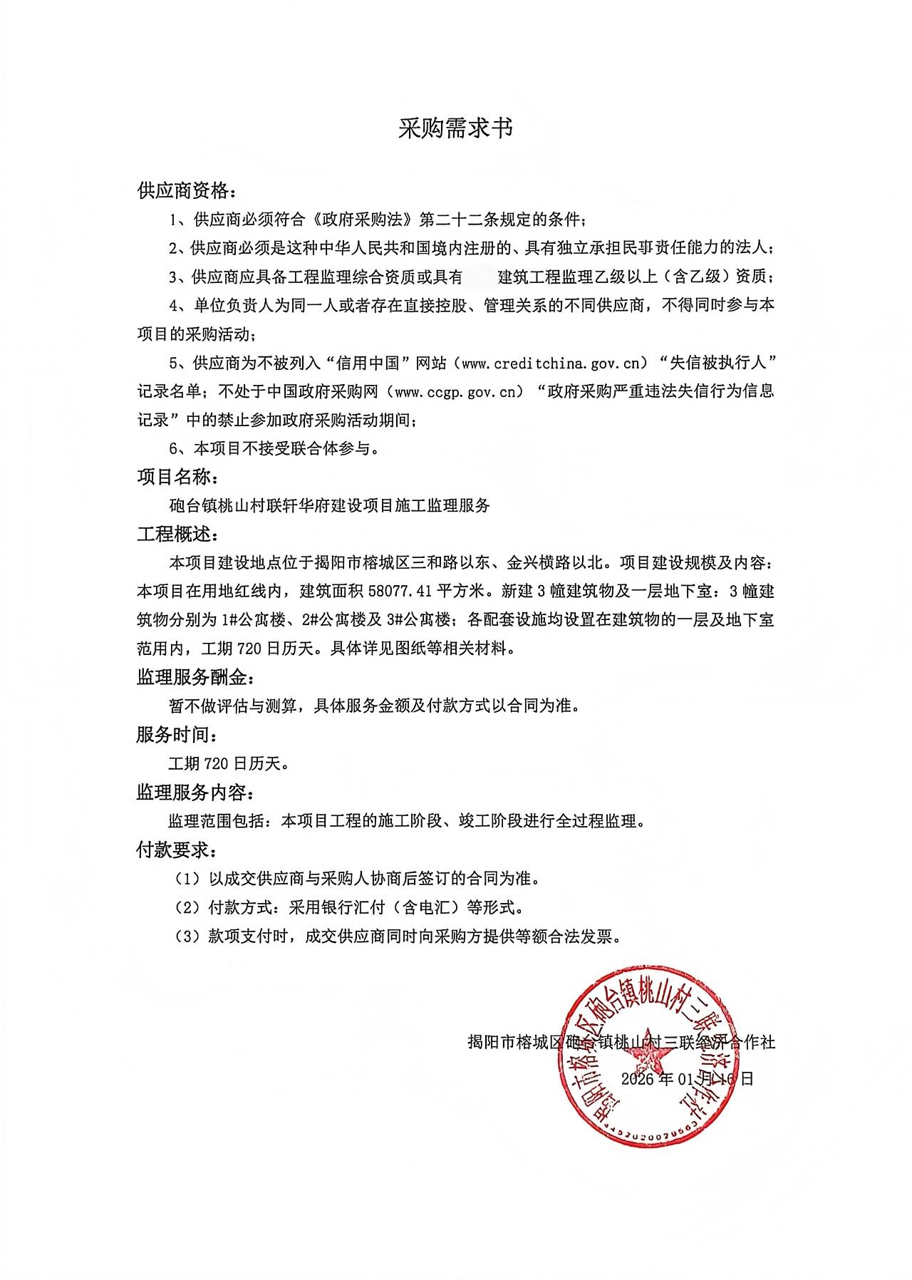 砲台镇桃山村联轩华府建设项目施工监理服务采购公告