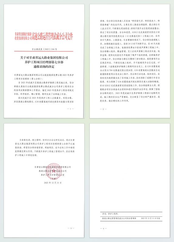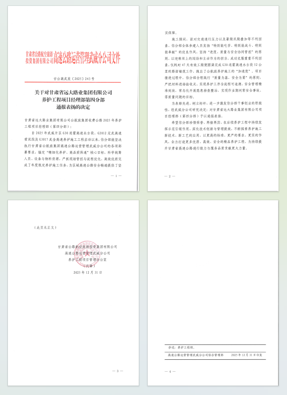 近日,远大公司****年养护工程项目经理部(第四、七分部)获甘肃公航旅集团收费公路武威分公司通报表扬,武威分公司对第四、七分部在****年养护工程中的优异表现、责任担当及精益管理水平予以高度评价与充分肯定。
