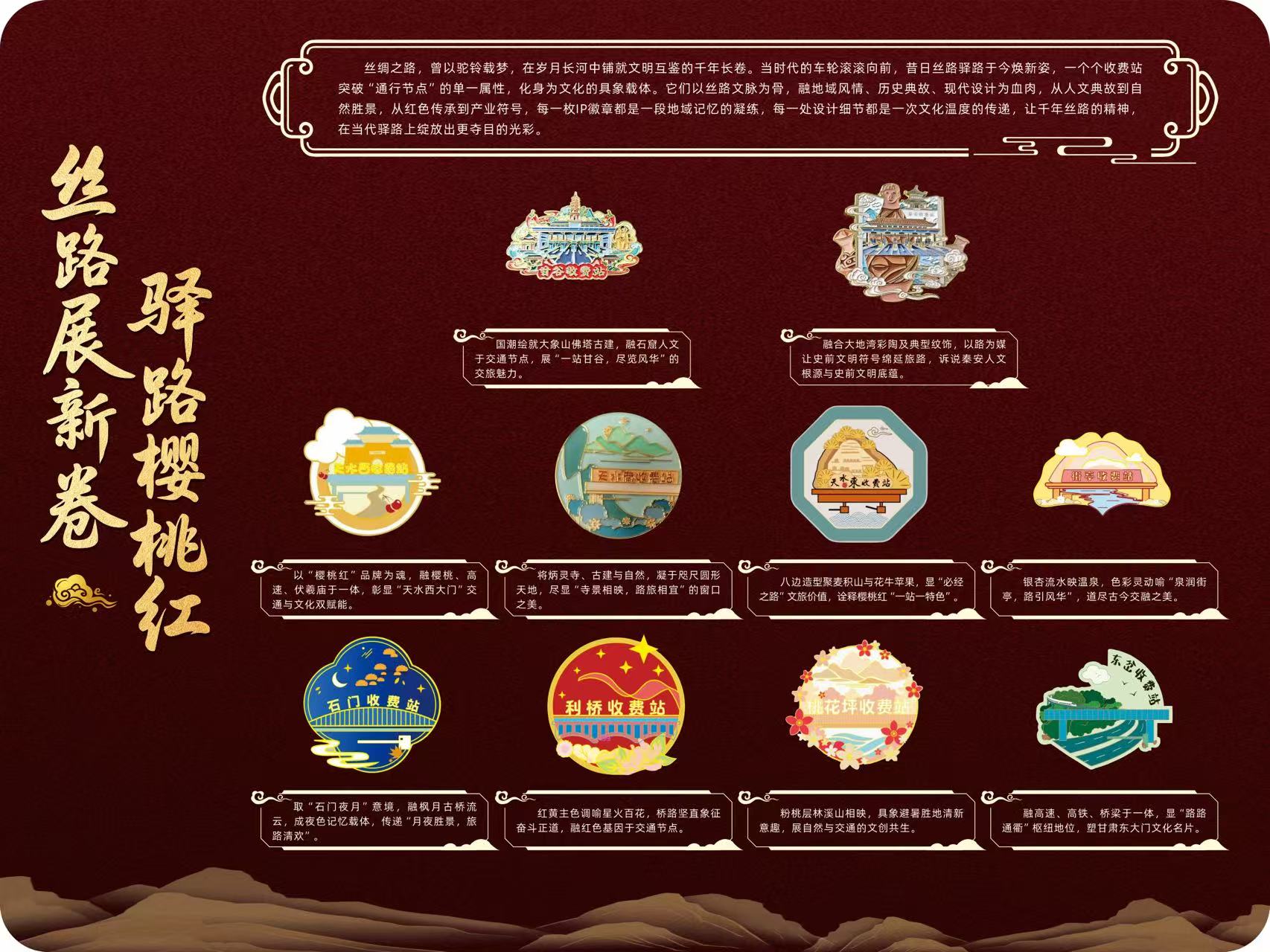 一站一徽章,一徽一文化。每枚徽章对应一个收费站的专属文化符号,或是站点所在区域的历史典故(如天水的伏羲文化、麦积山文化),或是收费站建筑的设计元素,让高速通行升级为“文化打卡”别样体验。整套徽章聚焦古丝绸之路重要节点地区,以所辖各收费站为载体,将境内高速收费站视为连接古今的“新驿站”与现代交通的“窗口”,融合现代交通枢纽与丝路文化基因,既展现高速路网的“通行之美”,又将收费站打造成为展示天水地域文化的“微型文化展台”。