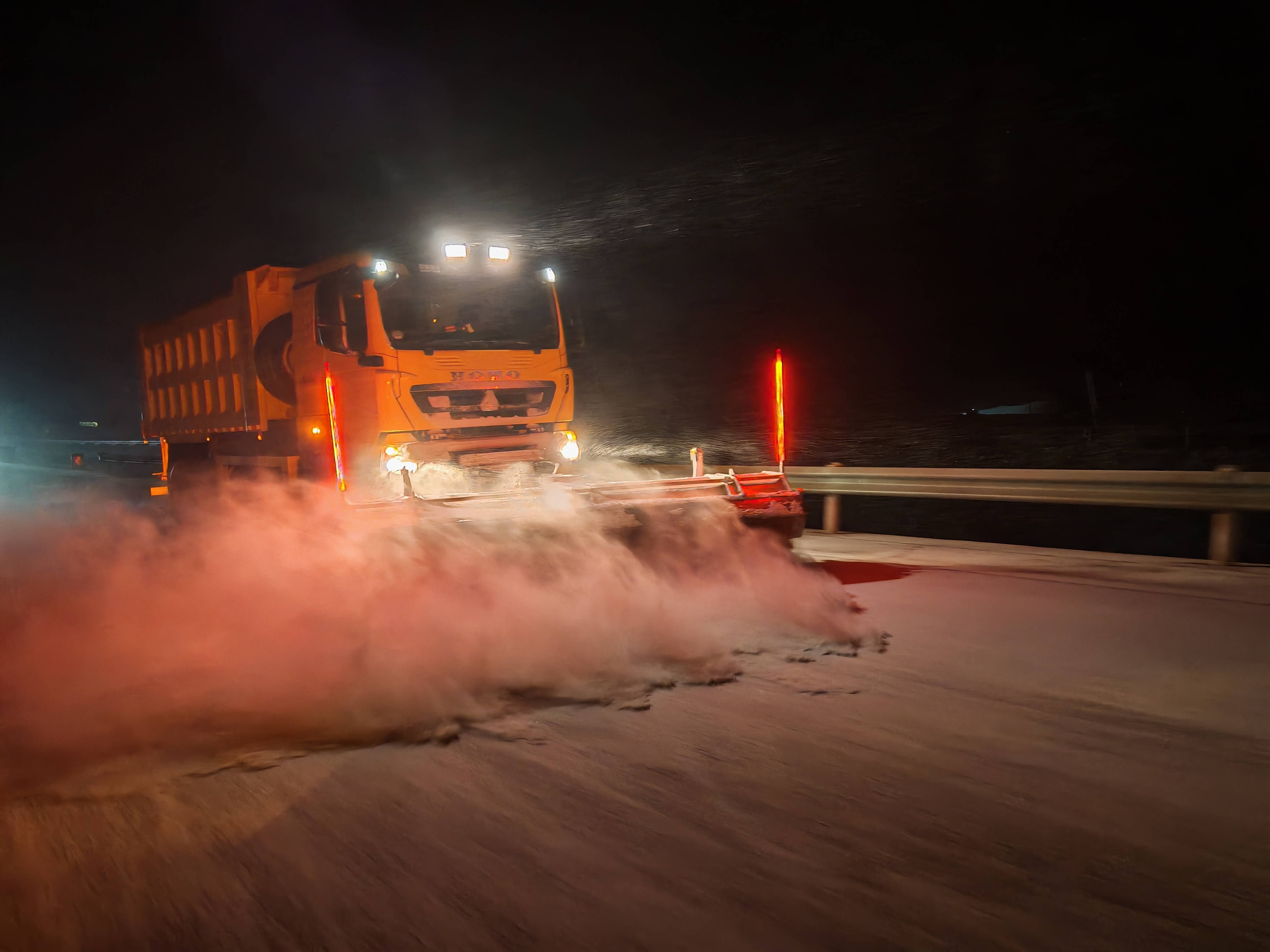 “轰轰轰——”凌晨六点,综合除雪车的轰鸣声划破雪夜的寂静。王荣带领的除雪作业队已经连续工作了十个小时,眼睛熬得通红,还是没有一丝困意。“这台机器一小时能处理六十公里路面的积雪,我们得跟时间赛跑。”在他身后,一排排除雪设备呈梯队作业,滚刷车清除浮雪,撒布机均匀抛洒融雪剂,铲雪车清理压实雪层,各环节紧密衔接,循环作业。在区域路段***********,由于气温更低、更易结冰,工作人员采取重点攻坚措施。养护部负责人常文生带头和同事们背着数十斤的融雪剂,徒步补撒关键点位。“大家再加把劲,不要漏掉每一处风险点,必须格外留意。”雪落无声,他们的身影在蜿蜒的路面上格外清晰。“看到车辆安全通过,心里就踏实了。”他的帽檐结满白霜,语气却温和坚定。