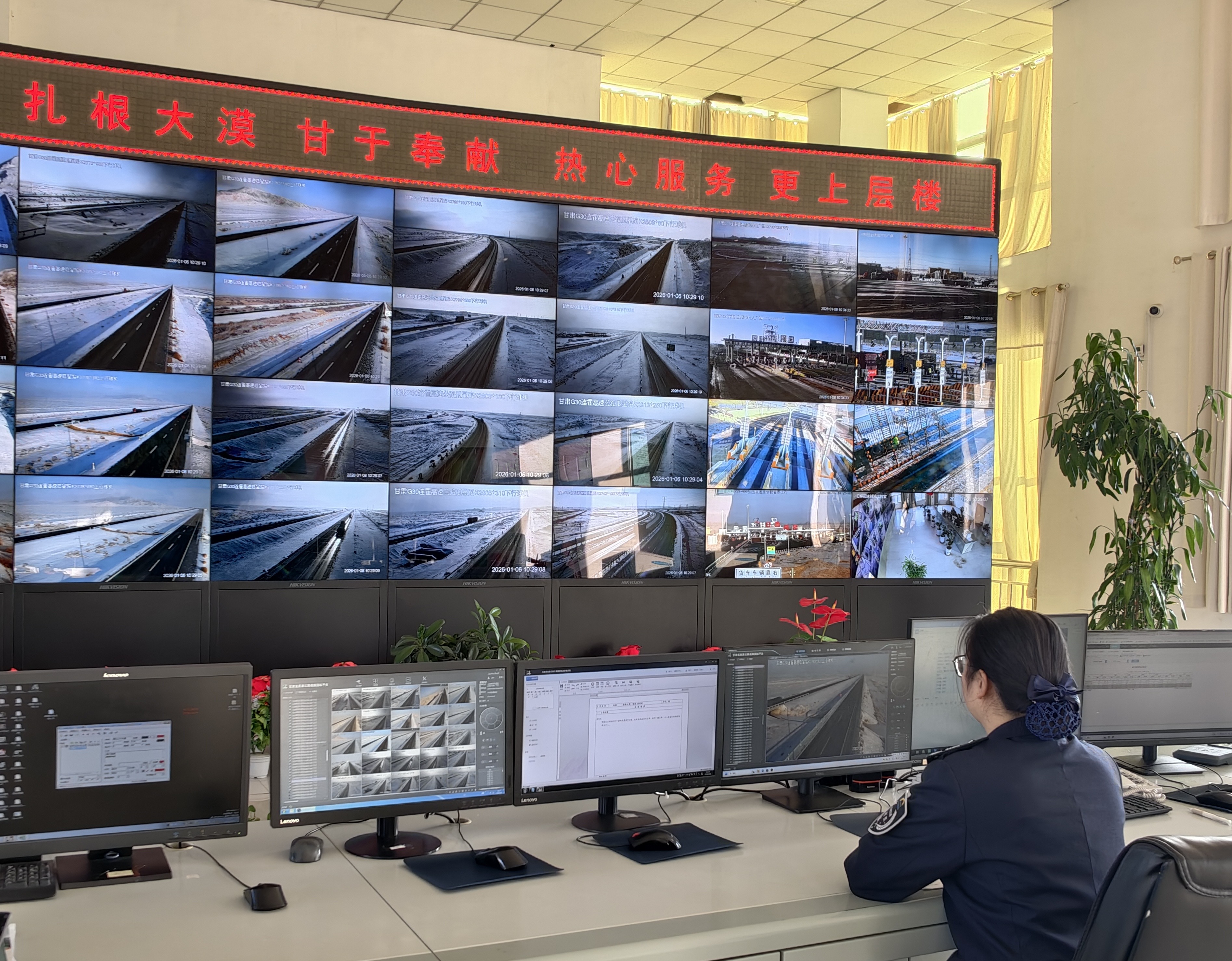 上午九点,风雪稍歇,但服务保障工作却进入另一番忙碌。在高速公路柳园北主线站,设立的“暖心驿站”里,“九层楼”服务人员逐车为司机送上热水、泡面及简单的医疗用品。从四川前往新疆的王师傅接过热水感慨道:“每次经过柳园都能喝上一口热的,太感谢你们了!”分中心同样彻夜无眠,监控员们已经接了上百个咨询电话,声音有些沙哑,但依然耐心解答。“是的,***柳园段在持续降雪。建议您稳驾慢行,我中心一直在循环除雪,保障您的出行安全……”实时更新播报道路通行信息的声音此起彼伏,通过电子情报板等多渠道发布,成为风雪中司乘人员的“千里眼”和“顺风耳”,为行人点亮一盏“看得见”的明灯。