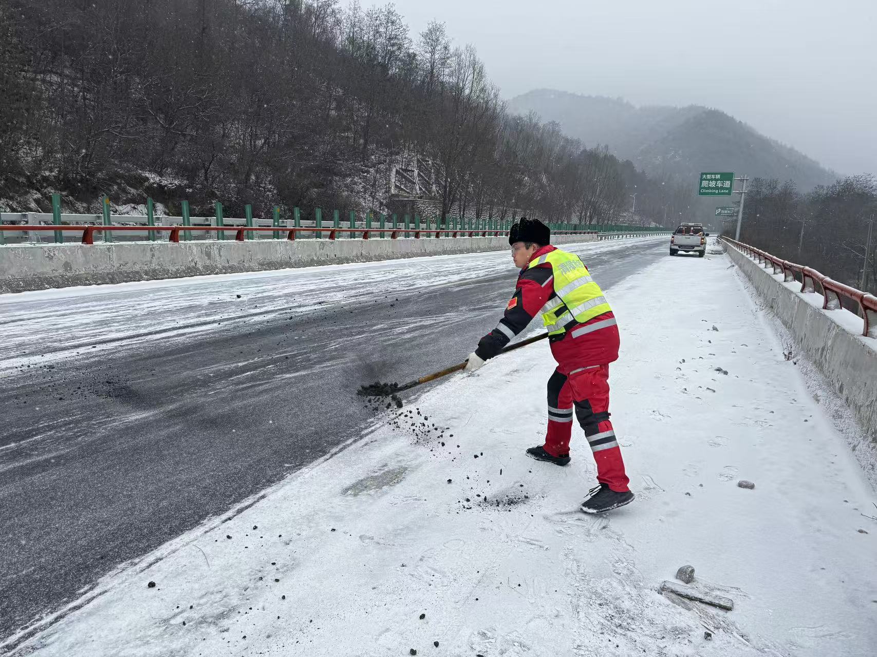 全时作战,人机协同不停歇。严格落实“领导分段负责、骨干定点跟进”机制,采取“机械为主、人工辅助、分段作业、循环推进”模式,养护人员持续开展巡查除冰。针对辖区隧道桥梁多、易结冰等特点,启动“人歇机不歇”连续作业,大型除雪设备多轮次循环清雪。按照“先主干后支线、先桥隧后平路”顺序,迅速清除主干道积雪。人工同步清理路侧、隧道口、桥梁护栏内侧等机械盲区,确保除雪无死角。在桥梁、坡道、弯道等关键点位,养护人员顶风冒雪,手持工具清积雪、破暗冰,适时补撒融雪剂,全力保障双向行车安全。