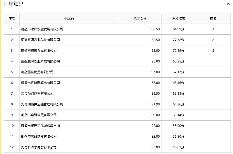 | *.专家评审结果信息告知:第一中标候选人:鹤壁市颂枫农业发展有限公司(报价:**.**%,得分:**.**分);第二中标候选人:河南菜妞农业科技有限公司(报价:**.**%,得分:**.**分);第三中标候选人:鹤壁市织豪食品有限公司(报价:**.**%,得分:**.**分)。 其他供应商报价和得分详见附件所示。 *.采购人依法确定第一中标候选人为本项目中标人,各有关当事人对成交结果有异议的,可以在成交公告期限结束后七个工作日内,以书面形式提出,质疑内容符合《政府采购质疑和投诉办法》(中华人民共和国财政部令第**号令)要求。逾期未提交或未按照要求提交的质疑函将不予受理。 *.投标供应商有政府采购合同融资意向的,请登录鹤壁市政府采购网进行融资意向登记,或者在“通知公告”栏目中获取融资渠道及联系方式。 | |||||||||||||||||||||||||||||||
