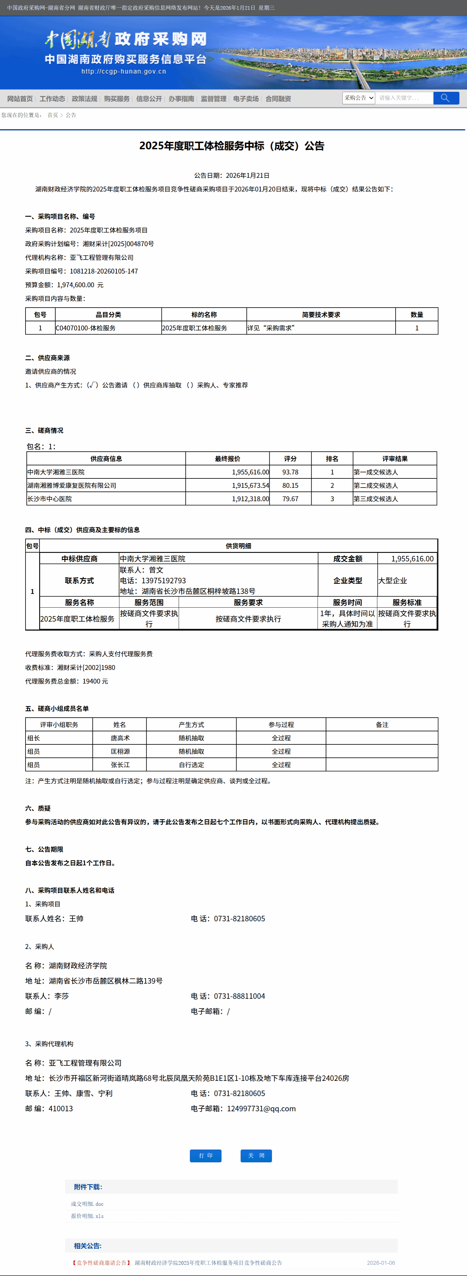 湖南省政府采购网:湖南财政经济学院2025年度职工体检服务中标(成交)公告