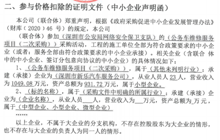 | * | 深圳市新乐汽车服务公司 | *)营业执照(或事业单位法人证书)等证明资料复印件;*)法定代表人证明书;*)法定代表人授权书;*)政府采购投标及履约承诺函;*)招标代理服务费承诺书;*)投标报价;*)《供应商基本情况表》、社保缴纳证明材料、股权关系证明材料;*)投标人具有二类或以上汽车维修企业备案证明。结论:资格核查通过。 | *.** |