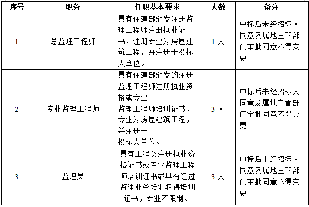 投标资格能力要求(包括但不限于资质人员、业绩等要求) | 投标人资格要求 | (*)资质条件: *、投标人具备独立法人资格,持有事业单位登记管理部门核发的事业单位法人证书或工商行政管理部门核发的企业法人营业执照,且在有效期限内。 *、 投标人须具备建设行政主管部门核发的工程监理综合资质甲级,或房屋建筑工程监理乙级(或以上)资质。 (*)财务要求:/ (*)业绩要求:/ (*)信誉要求: ①投标人没有被列入失信被执行人黑名单,须提供在“中国执行信息公开网”(****://****.*****.***.**/******/)的网页截图或网页打印件。 ②投标人没有处于责令停业,财产被接管、冻结、查封,破产或债务重组等状况等;具有相应的项目管理体系和项目管理能力、财务和风险承担能力。 (*)总监理工程师的资格要求(数量*人):具有注册在投标人单位的房屋建筑工程专业的《注册监理工程师执业证书》,且证书在有效期内。 (*)其他主要人员要求: *)根据广东省建设厅“粤建管字[****]**号文”《转发建设部关于印发《房屋建筑工程施工旁站监理管理办法(试行)》的通知》规定,本工程监理机构最少配置人数为*人。投标人认为有必要的亦可增加其他专业人员。投标时按下表《项目驻场监理机构人员要求一览表》进行填报。监理机构人员必须施工全过程驻场工作。 项目驻场监理机构人员一览表 ![]() 注:①项目驻场监理机构人员均须在“云浮市智慧建筑管理服务信息平台”登记,如为广东省以外的投标人人员班子均须在“进粤企业和人员诚信信息登记平台”已登记备案。 ②项目驻场监理机构人员均须招标公告发出前连续*个月的社保证明。(“招标公告发出前连续*个月的社保证明”的时间指:****年**月*****年**月。)社保证明材料必须在对应所属的投标人单位(或其分支机构)购买,以社会保障部门加盖公章或业务章为准。社保证明材料如为花名册的,投标人须标记出本项目投入人员的对应社保。符合国家或各省市相关文件要求可减免或缓缴社保的,可提供当地政府部门允许缓缴社保的相关文件作为缴纳社保的证明。)退休返聘人员如无社保证明需提供返聘证明或合同。 *)项目监理机构的监理人员在工程施工阶段监理中,对关键部位、关键工序的施工质量实施全过程现场跟班的监督。本工程现场施工旁站最少监理人员参照下表配套。 工程项目监理最少人数配置参照表 ![]() (*)试验检测仪器设备要求:/ (*)其他要求: ①投标人须具有独立法人资格并依法取得营业执照,且处于有效期内。 ②投标人须是未被有关部门明令取消投标资格或暂停承接业务,须按云建通〔****〕**号文和云建市[****]**号等有关规定办理好登记手续,企业参加工程投标、勘察、设计、施工、监理、项目管理等建筑活动的各类注册人员和相关从业人员,应当在“云浮市智慧建筑管理服务信息平台”登记;并持有“云浮市智慧建筑管理服务信息平台”最新月度企业信用评价等级的网页截图(其有效范围为信用等级*级或以上的,新登记备案的还没评级可不持有)。广东省以外的投标人须按广东省住房和城乡建设厅(粤建市〔****〕**号文)的规定,持有在广东建设信息网“进粤企业和人员诚信信息登记平台”专栏关于投标人进粤企业及人员信息录入的网页截图。 ③与招标人存在利害关系可能影响招标公正性的法人、其他组织或者个人,不得参加投标。单位负责人为同一人或者存在控股、管理关系的不同单位,不得参加同一标段投标或者未划分标段的同一招标项目投标。 ④投标人提供对参与本次建设工程项目招标投标活动中提交的证明资料(包括但不限于营业执照、资质、业绩(如有)、获奖(如有)、人员、财务(如有)、社保(如有)、纳税(如有)、各类证书等)的真实性、有效性签署的投标人承诺书(详见投标文件格式中的投标人承诺书)。 | ||