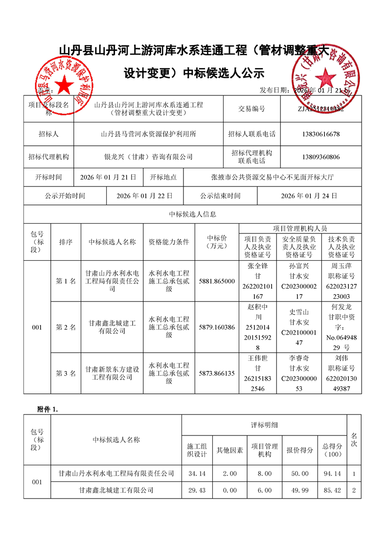 [市本级]山丹县山丹河上游河库水系连通工程(管材调整重大设计变更)中标候选人公示