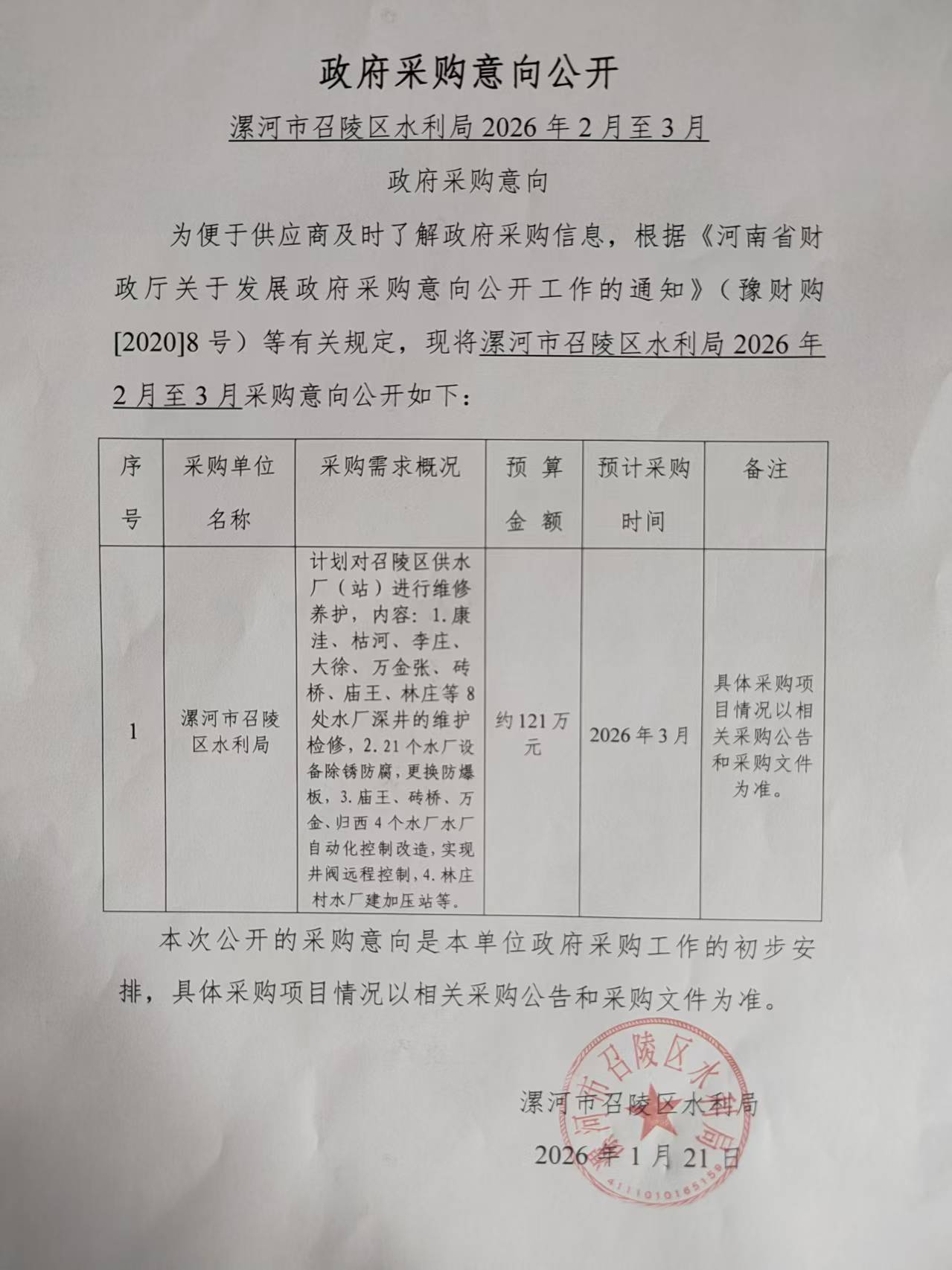 漯河市召陵区水利局2026年2至3月政府采购意向