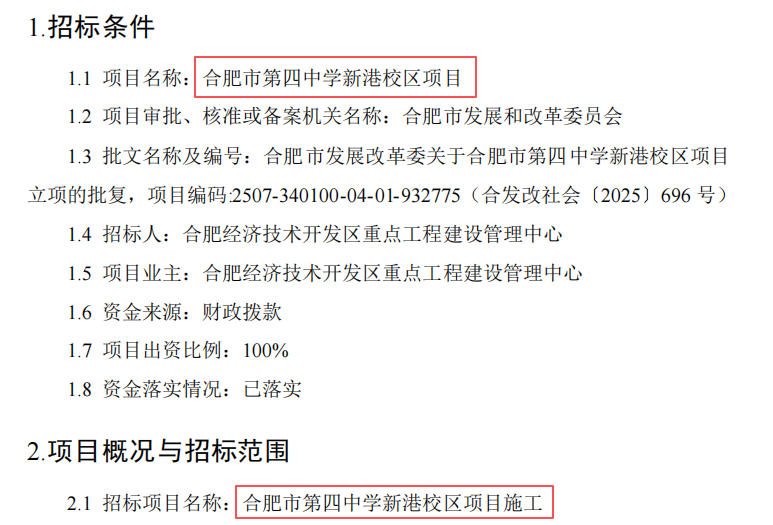 合肥市第四中学新港校区项目施工招标文件补疑*