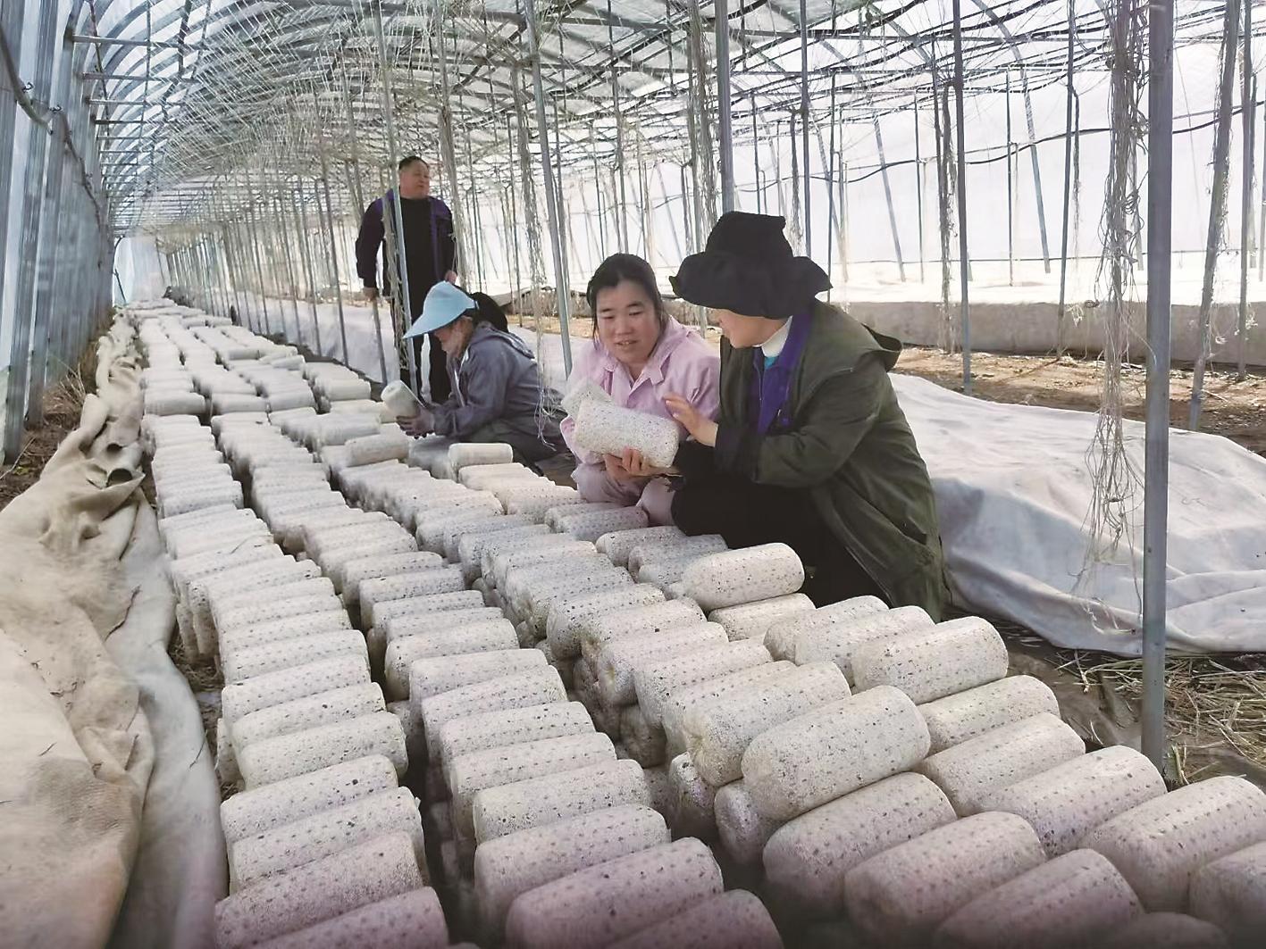 一排排菌棒整齐排列,农技人员向农民讲解技术要领。