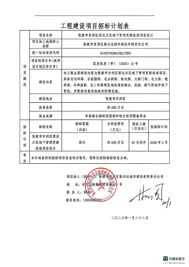 张掖市甘州区西北片区地下管网更新改造项目设计招标计划