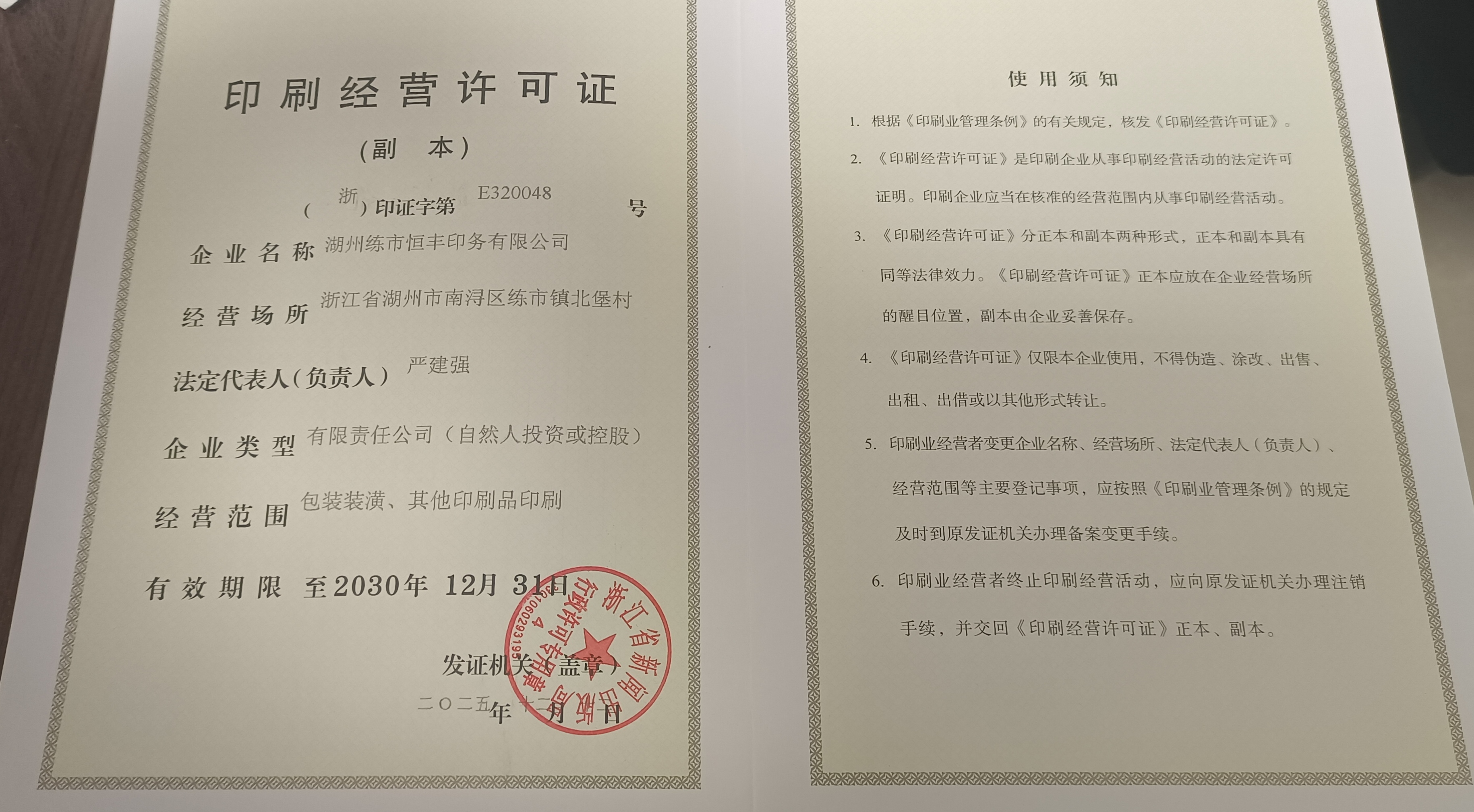 湖州练市恒丰印务有限公司印刷服务(《印刷业管理条例》其他印刷品