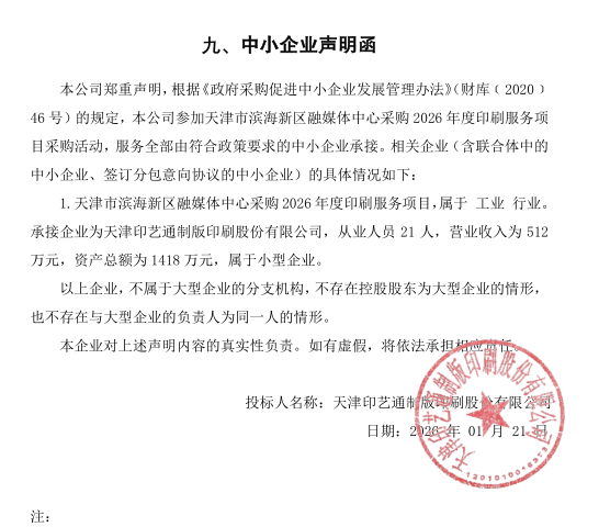 受天津市滨海新区融媒体中心委托,天津市滨海新区政府采购中心以竞争性磋商方式,对天津市滨海新区融媒体中心采购****年度印刷服务项目实施采购,现将成交结果公布如下: 一、项目名称和编号 *.项目名称:天津市滨海新区融媒体中心采购****年度印刷服务项目 *.项目编号:**************** 二、成交信息 *.成交供应商名称:天津印艺通制版印刷股份有限公司 *.成交供应商地址:南开区三马路***号双鹿大厦写字楼一楼底商 *.供应商评审报价、评审总得分及排序情况:见附件 *.主要成交标标的名称、规格型号、数量、单价、服务要求或者标的基本概况:印刷服务 三、磋商小组成员名单 潘秉方、魏真、王艳肖、焦美红、刘馨(采购人代表) 四、项目联系人及联系方式 *.联系人:郭晓萌 *.联系电话:************ 五、采购人的名称、地址和联系方式 *.采购人名称:天津市滨海新区融媒体中心 *.采购人地址:天津市滨海新区中心商务区新华路和新港二号路交口瑞龙城市广场*新港路****号 *.采购人联系电话:刘馨,**** ******** 六、采购代理机构的名称、地址和联系方式 *.采购代理机构名称:天津市滨海新区政府采购中心 *.采购代理机构地址:天津市滨海新区营口道***号 *.采购代理机构联系方式:************ 七、质疑方式 参与本项目政府采购活动的供应商认为成交结果使自己的合法权益受到损害的,可以在成交结果公告期限届满之日起*个工作日内,以书面形式向采购人天津市滨海新区政府采购中心提出质疑,逾期不予受理。 八、采购人和评审专家推荐意见 无 九、本项目向成交供应商收取服务费*元。 十、成交结果公告期限 成交结果的公告期限为*个工作日。 十一、磋商文件公告:见附件