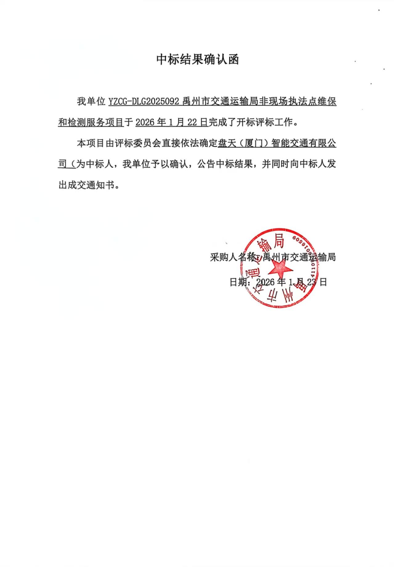 YZCG-DLG2025092禹州市交通运输局非现场执法点维保和检测服务项目-中标公告