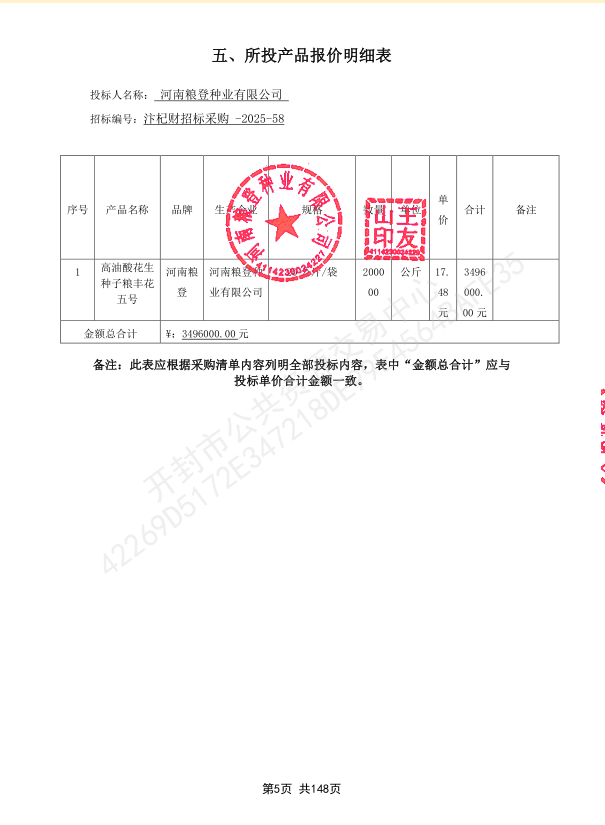 | *、提出质疑的渠道和方式:根据汴公管办(****)**号文规定,若供应商对上述结果有质疑,可在中标(成交)公告发布之日起七个工作日内以线上形式向采购人提出质疑,逾期将不再受理,采购人应当自收到质疑之日起*个工作日内作出答复,若质疑人对质疑处理意见有异议或者采购人未在规定的时间内作出答复的,质疑人可在规定时间内以线上形式向该项目行政监督部门提出投诉。(开封市公共资源交易信息网重要文件栏中有政府采购项目质疑、投诉文本格式及要求) *、通过名单:河南粮登种业有限公司,开封市百草农业发展科技有限公司,开封万青种业科技有限公司 *、未通过名单及原因:河南顺丰种业科技有限公司:所投产品报价明细表中,金额总合计与投标单价合计金额不一致;河南智通农业科技有限公司:经营授权委托书(委托有效期限)不响应招标文件要求,上述两家投标人符合性检查不合格,均按无效投标处理。 *、最终得分:河南粮登种业有限公司 **.**分 *、监督单位:杞县财政局采购办 联系电话:************* | |||||||||||||||||||||||||||||||