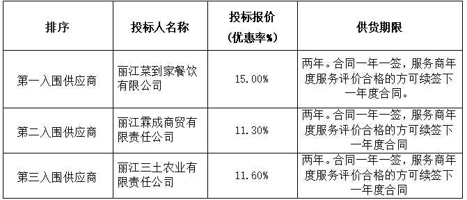 丽江阿丹阁大酒店有限责任公司*********年服务烟草食堂生鲜供应商采购项目【招标编号:*************】于****年*月**日已完成评标工作,经评标委员会推荐,招标人确定,现对中标结果公示如下: