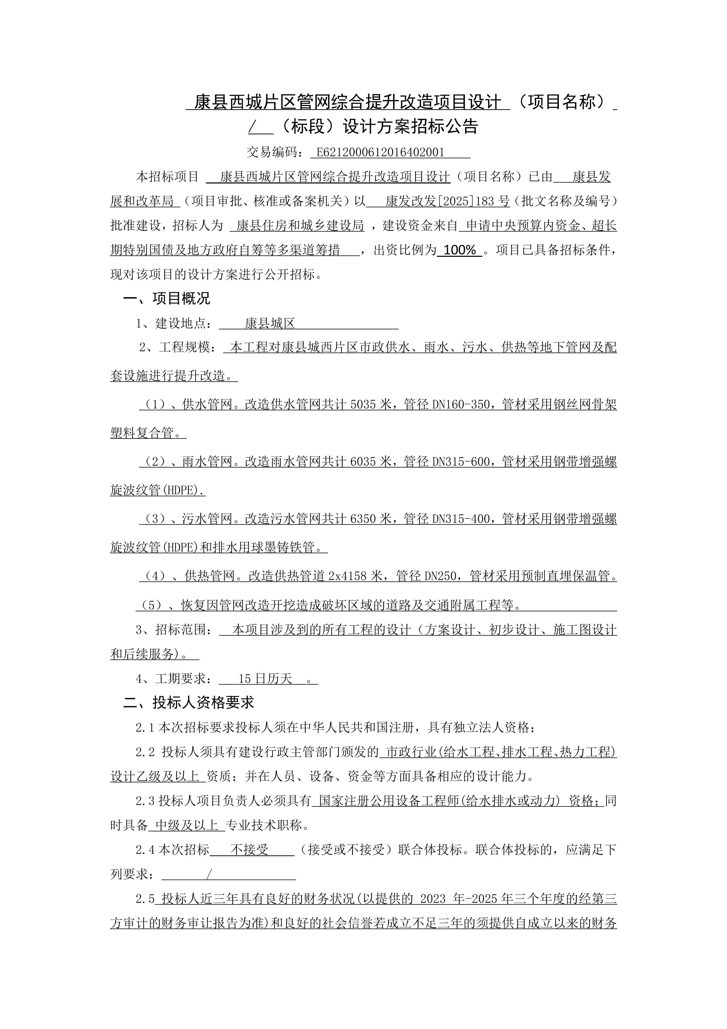 康县西城片区管网综合提升改造项目设计招标公告招标/资审公告