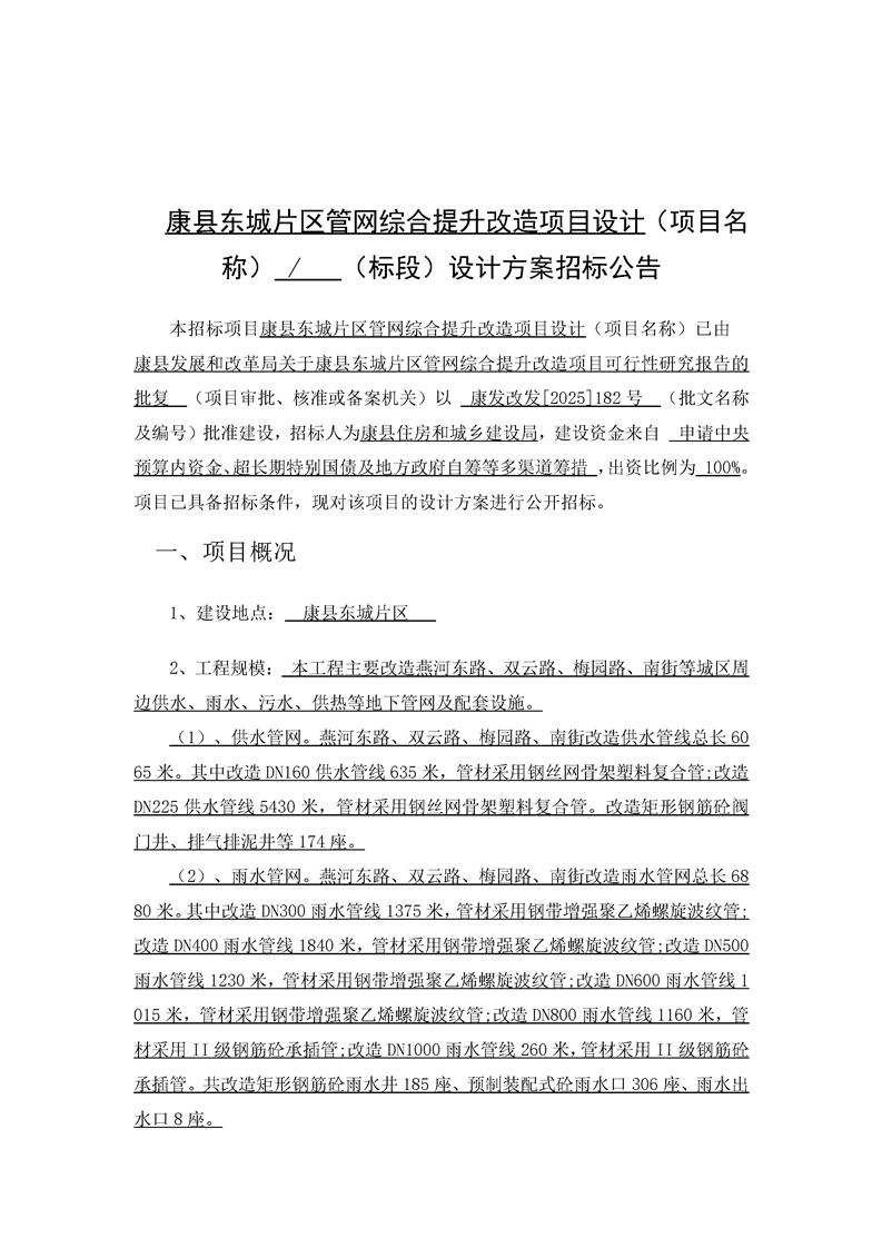 康县东城片区管网综合提升改造项目设计招标公告招标/资审公告