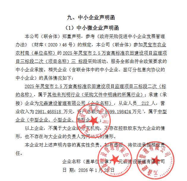 | 供应商名称:元森建设管理有限公司 总监理工程师:宋红喜 联系电话:************* 证书编号:********** 机构代码证:****************** 监督部门:灵宝市财政局政府采购监督管理科 联系电话:************ 监督单位:灵宝市农业农村局 电话:************ 本公告公示期为*个工作日。供应商对成交结果有异议的,可以在本成交公告公示期(*个工作日)满后*个工作日内,以书面形式向采购代理机构提出质疑(法定代表人签字并加盖单位公章),由法定代表人或其授权代表携带企业营业执照(加盖公章)及本人身份证件一并提交,并以质疑函接受的确认日期作为受理时间,逾期未提交或未按照要求提交的质疑函将不予受理。 | |||||||||||||||||||||||||||||||