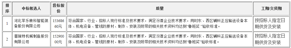 汾酒2030技改原酒产储能扩建项目(一期)总承包(EPC)东、西区辅料正压输送设备采购项目中标候选人公示