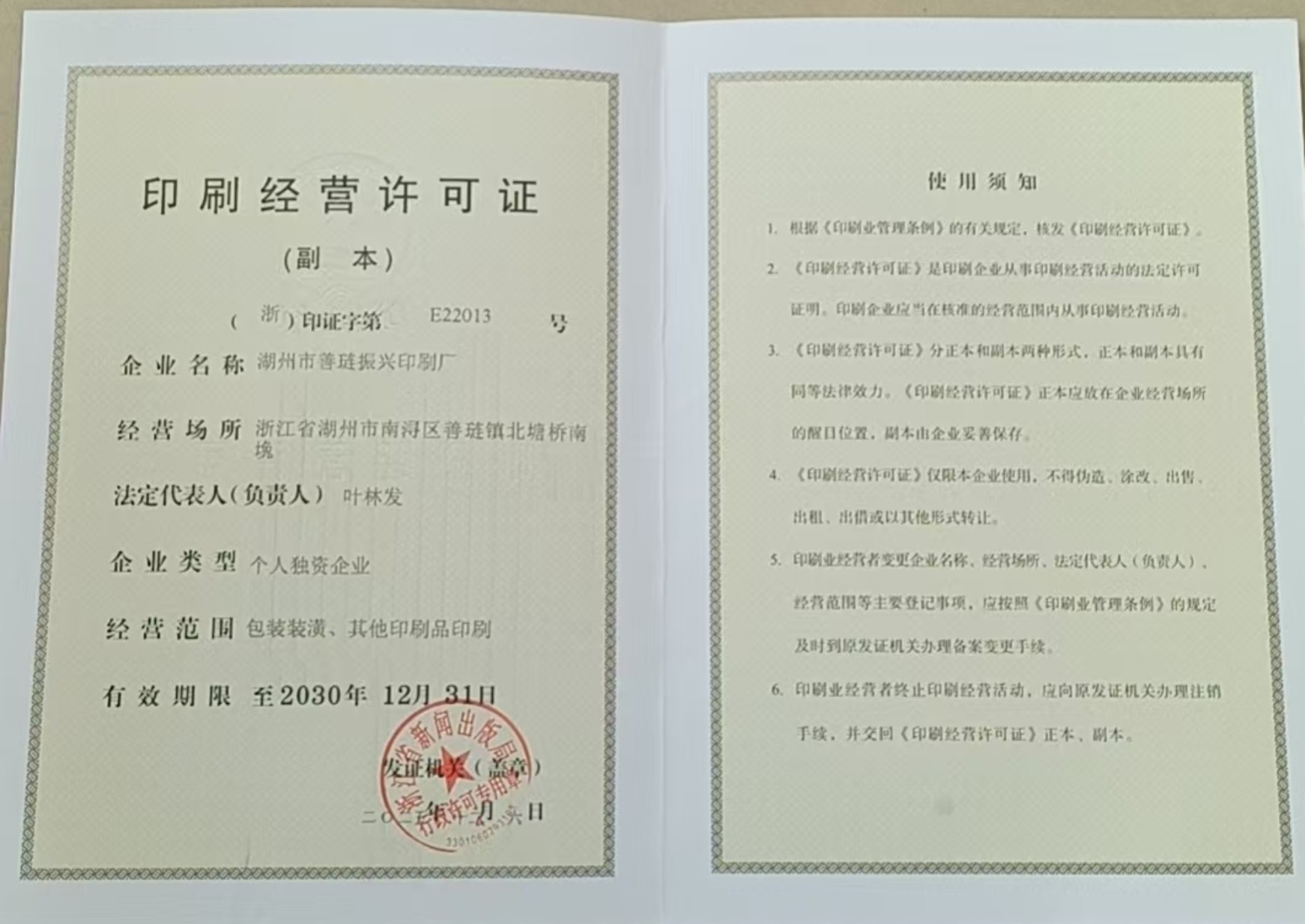 湖州市善琏振兴印刷厂印刷服务(《印刷业管理条例》其他印刷品