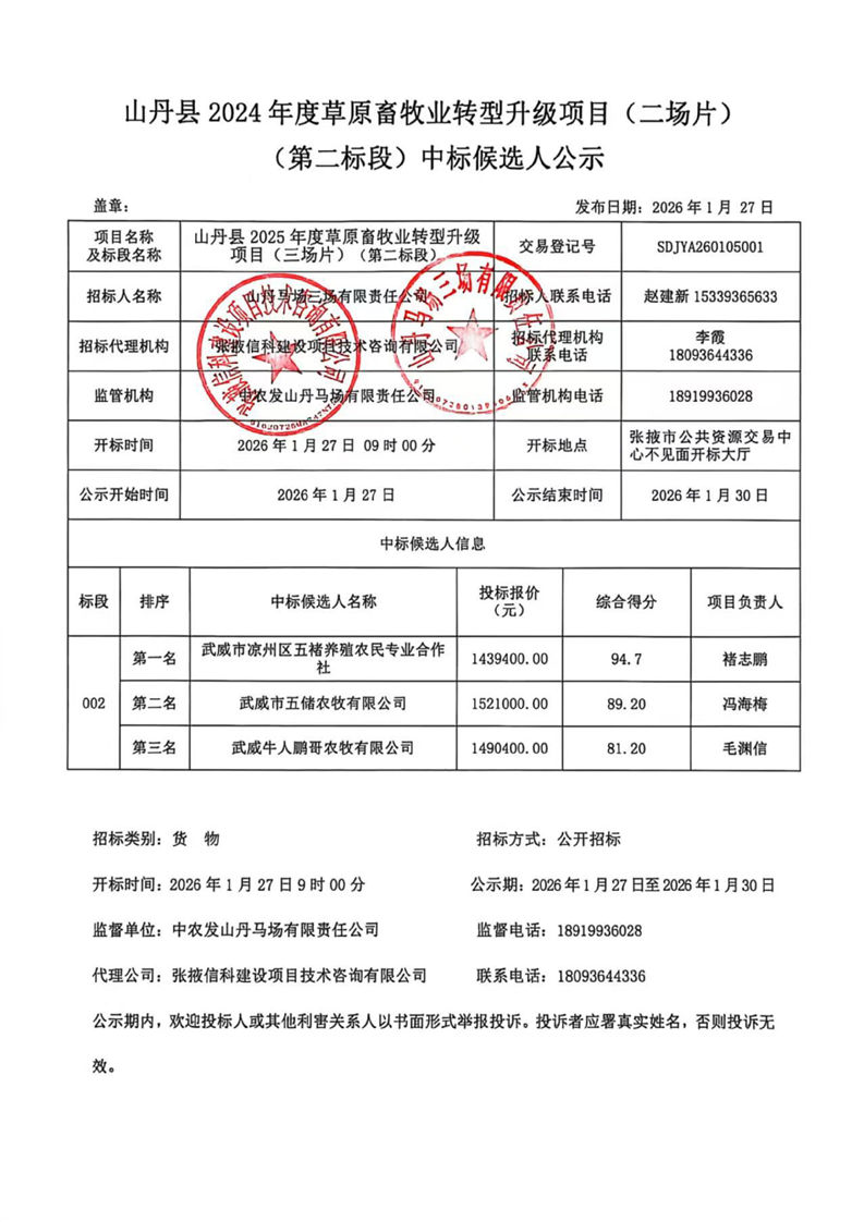 [山丹县]山丹县2025年度草原畜牧业转型升级项目(三场片)(第二标段)中标候选人公示