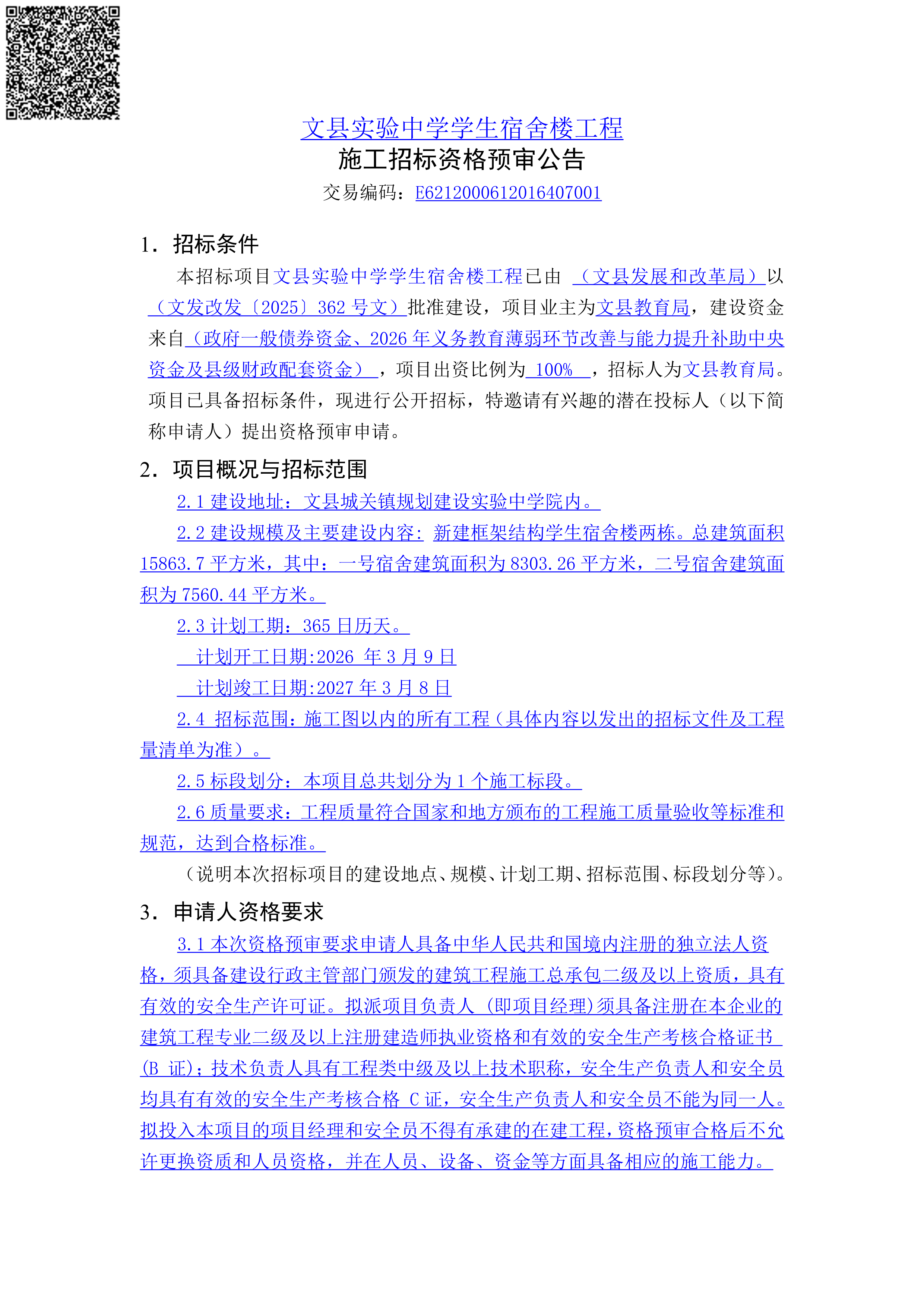 文县实验中学学生宿舍楼工程施工招标资格预审公告