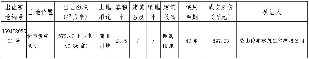 【中标公示】黄山区集体经营性建设用地使用权挂牌成交结果公示(HJHGT2025P010)【黄山区】【公告中】