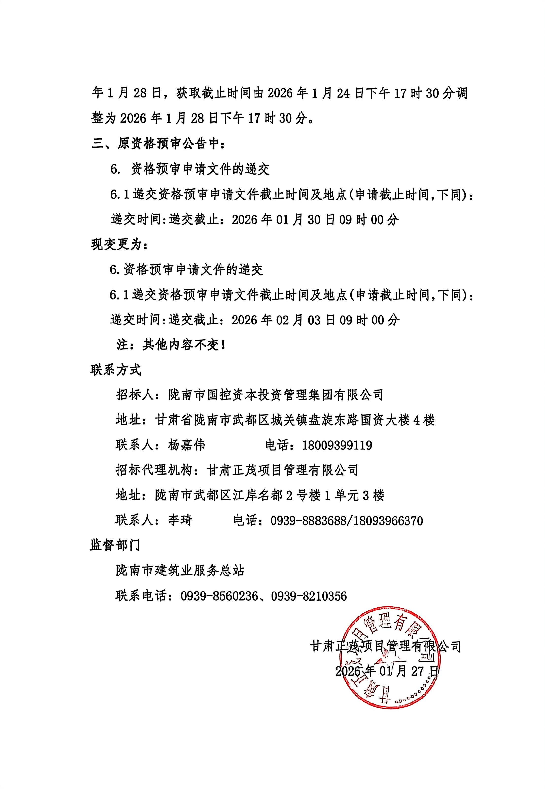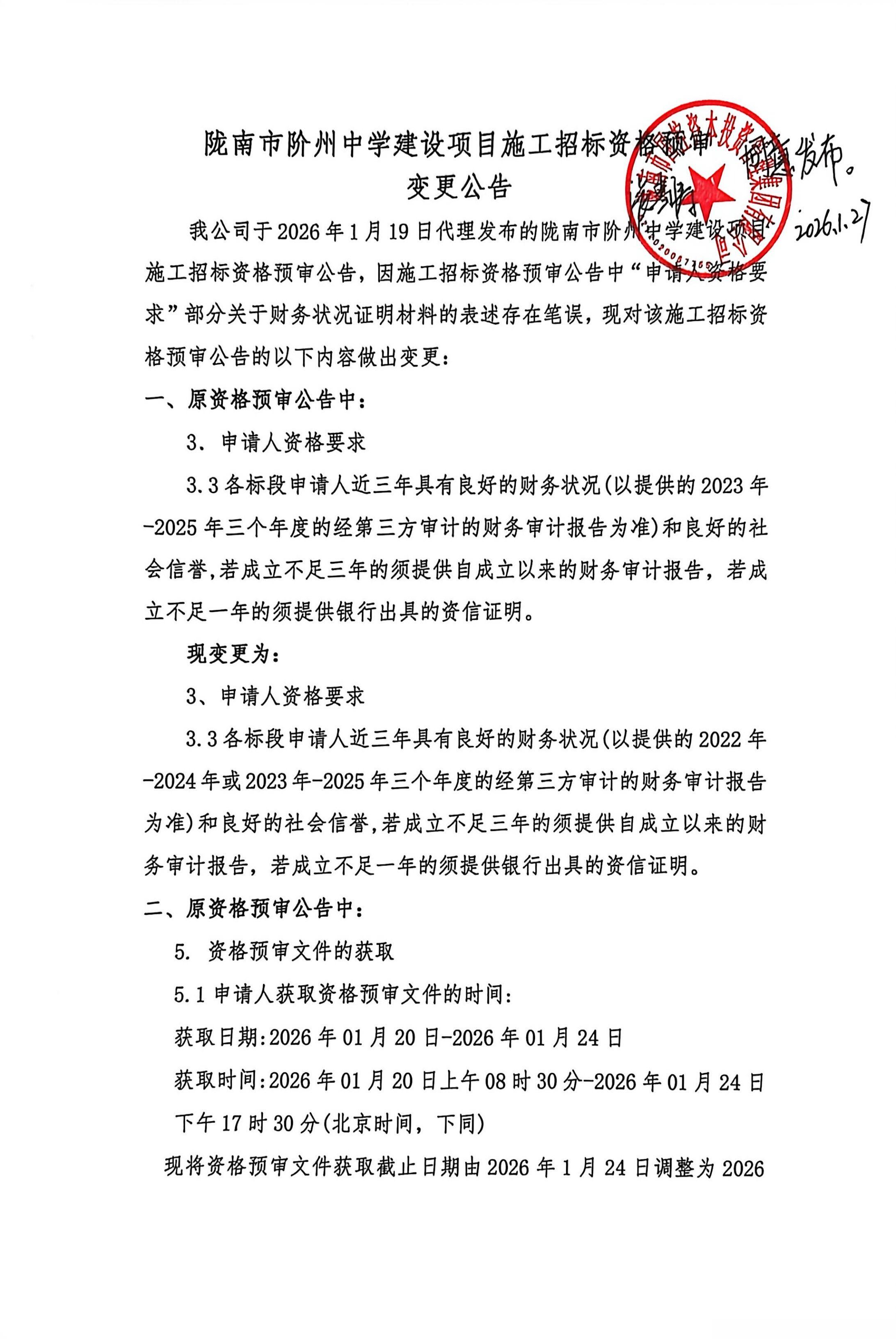陇南市阶州中学建设项目施工招标资格预审变更公告[变更公告]