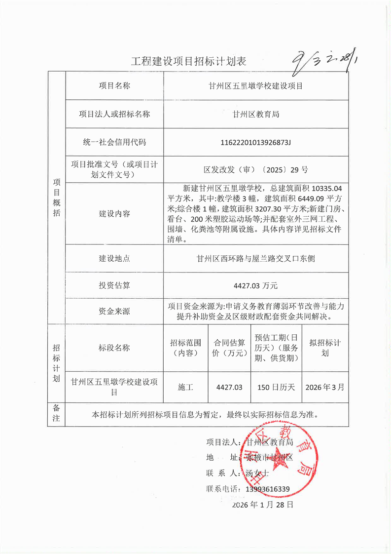 | 招标项目名称 | 甘州区五里墩学校建设项目 | ||