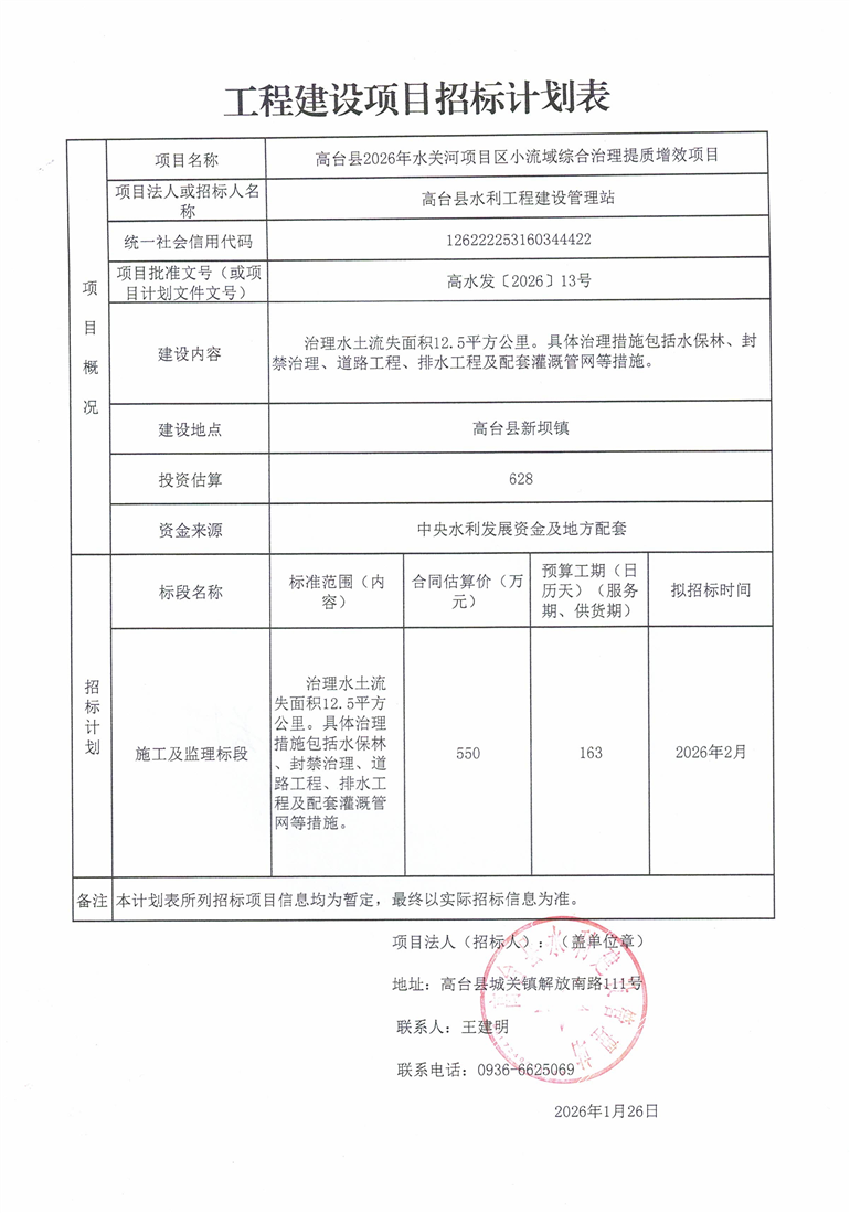高台县2026年水关河项目区小流域综合治理提质增效项目招标计划