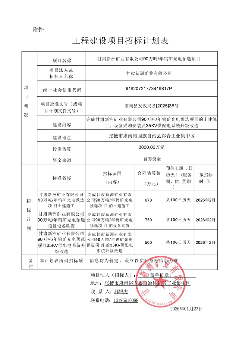 甘肃新洲矿业有限公司90万吨/年钨矿光电预选项目招标计划