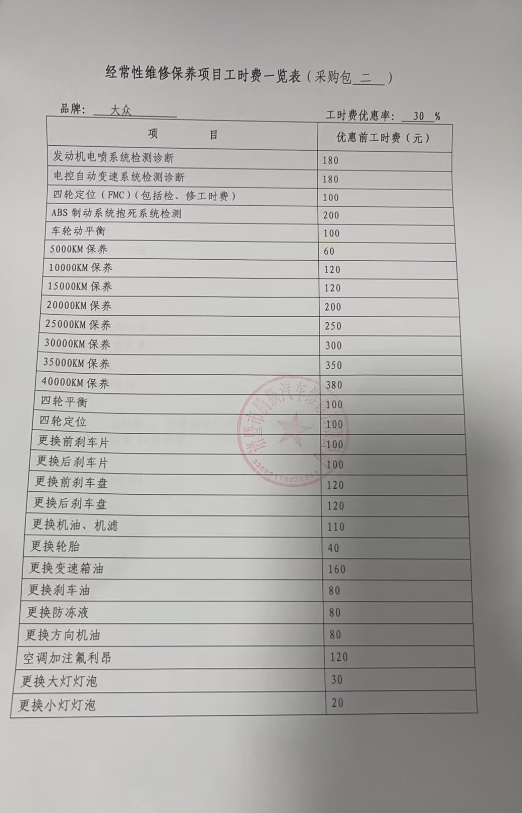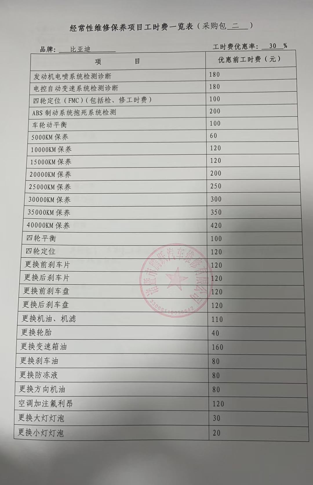 经常性维修保养项目工时费览表:********************************.***