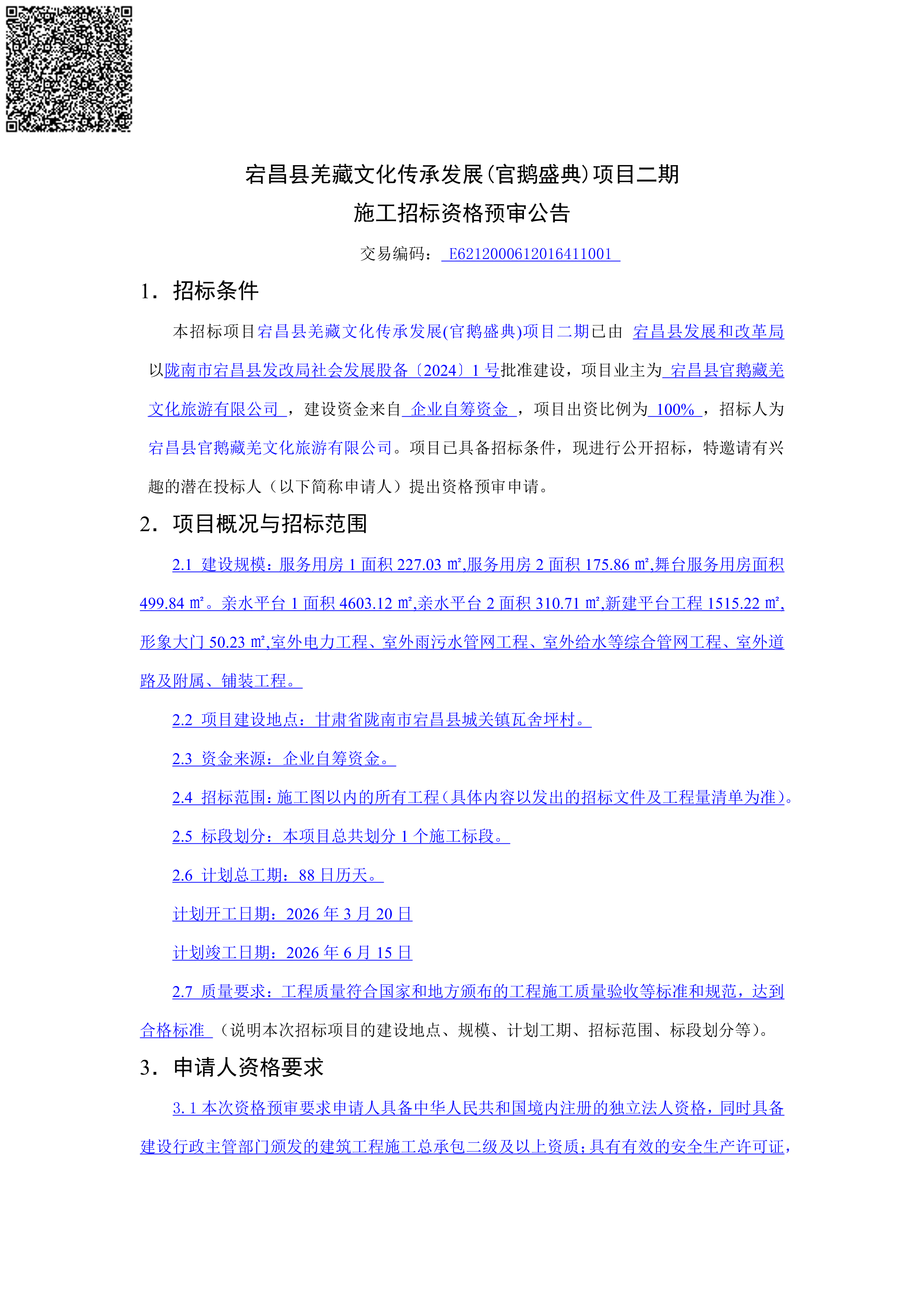 宕昌县羌藏文化传承发展(官鹅盛典)项目二期施工招标资格预审公告