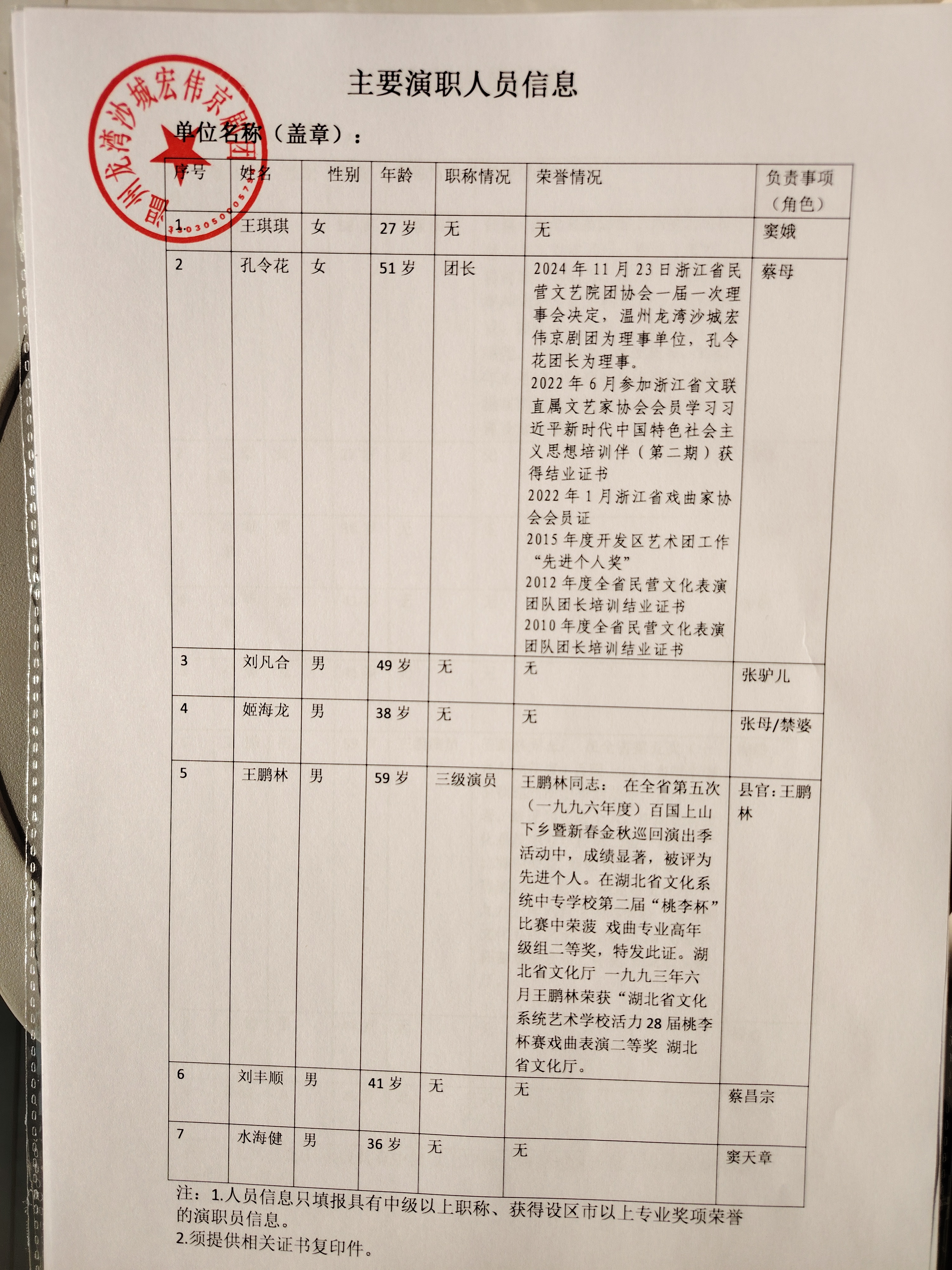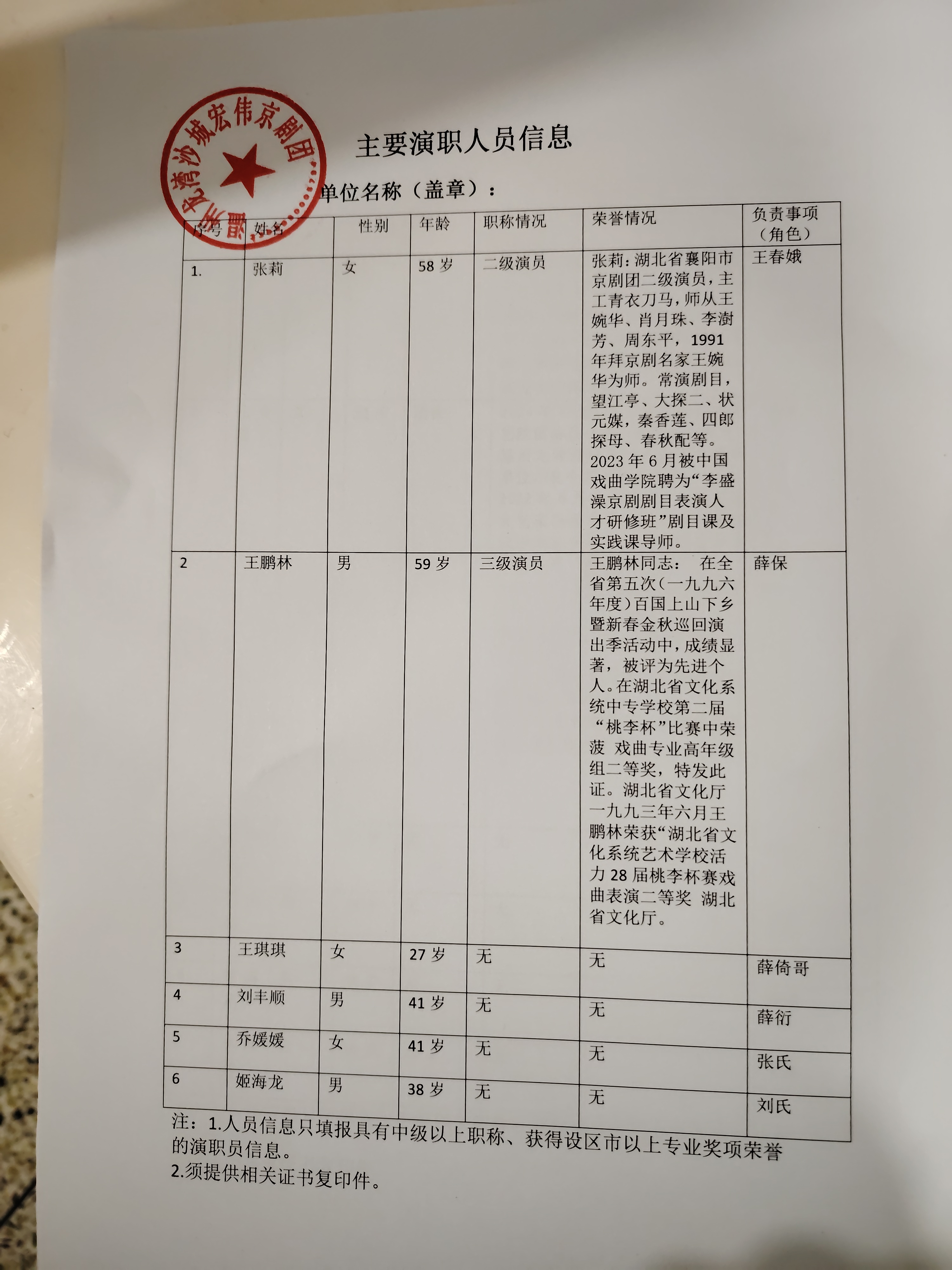 演职人员信息(按《公告》附件*格式填写):六月雪主演人员名单盖章版.***