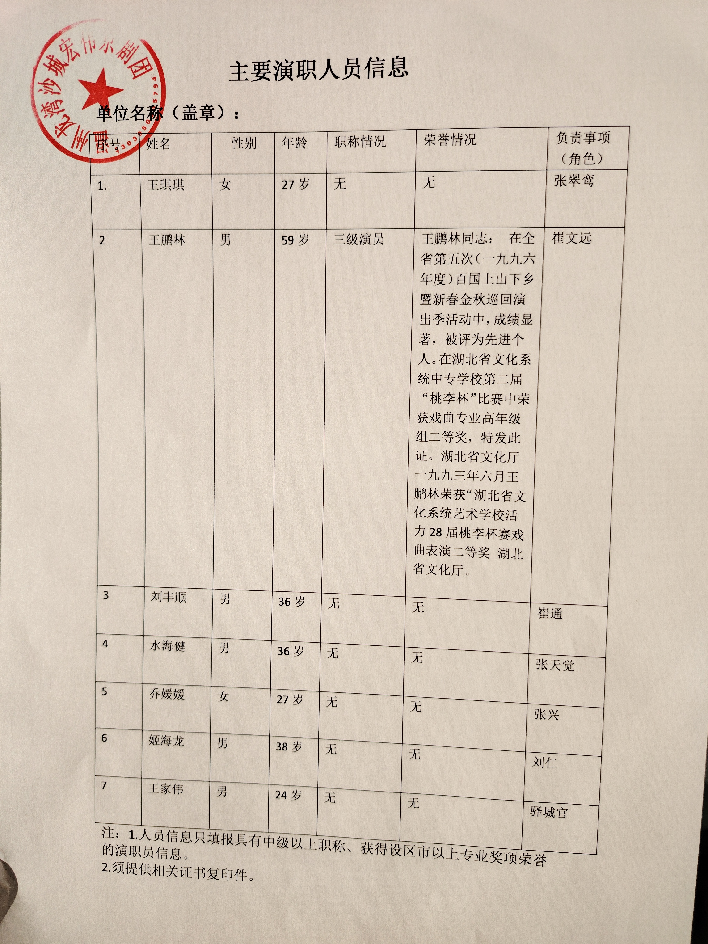 演职人员信息(按《公告》附件*格式填写):潇湘夜雨主演表盖章版.***
