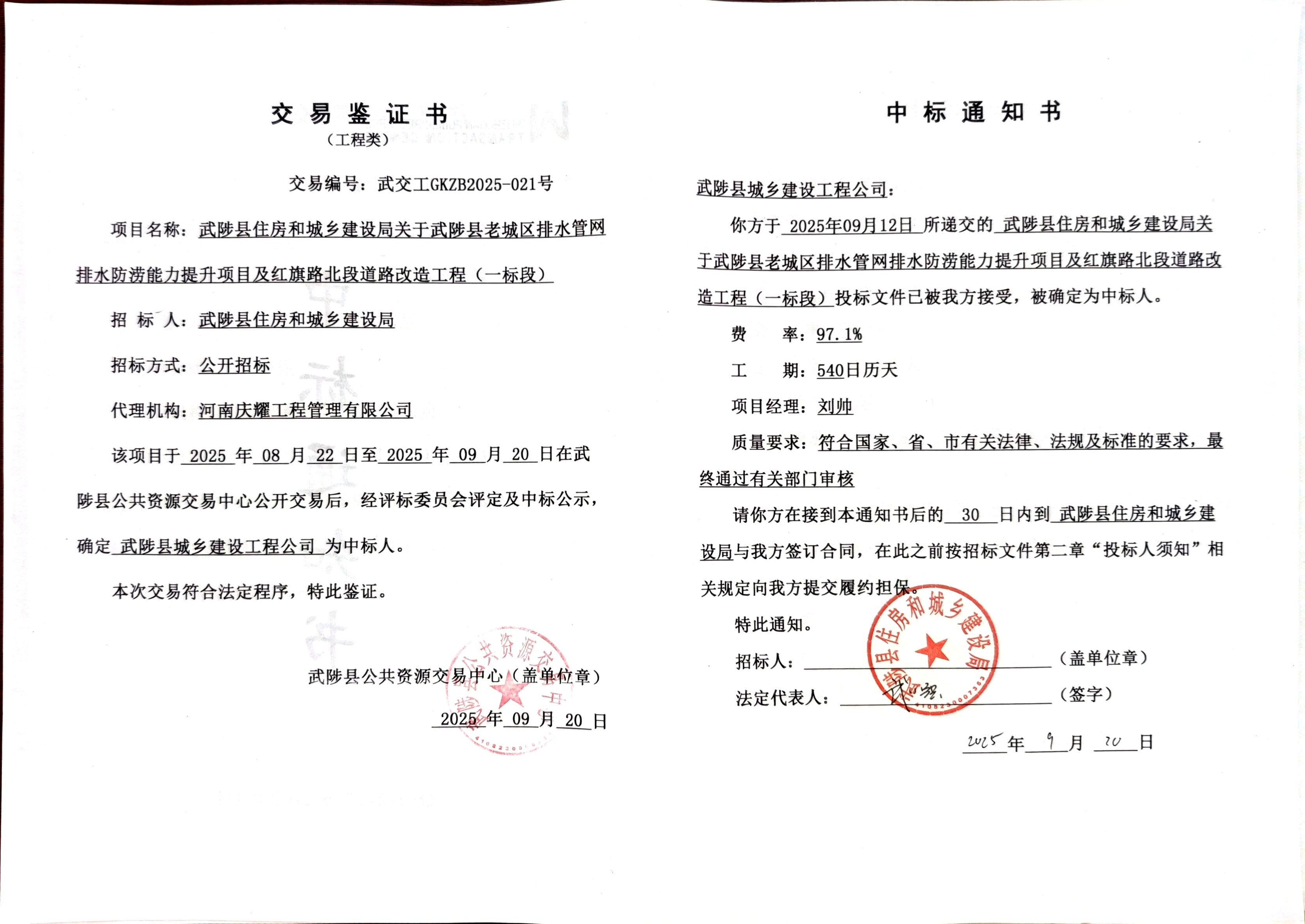 | 二、合同名称:武陟县住房和城乡建设局关于武陟县老城区排水管网排水防涝能力提升项目及红旗路北段道路改造工程项目 | ||||||||||||