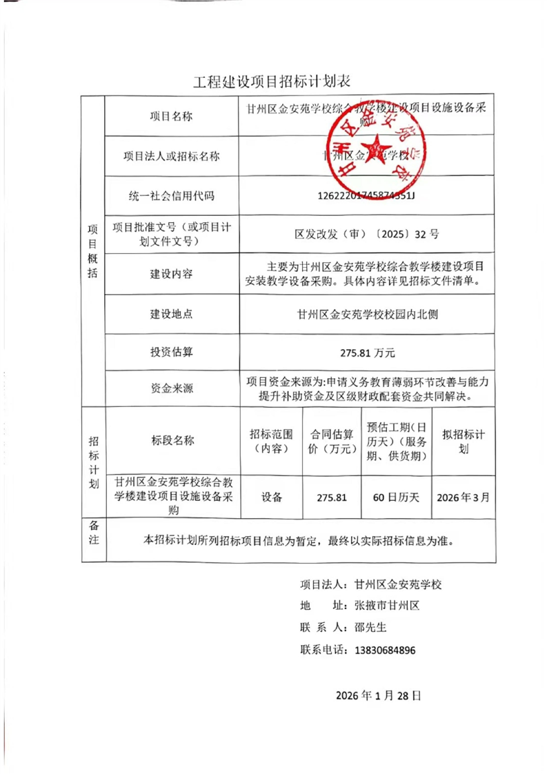 甘州区金安苑学校综合教学楼建设项目设施设备采购招标计划
