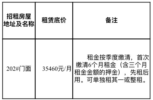 *.招租评定方式:公开招租,由招租方组织评委专家对竞租方的资格条件及相关资料进行审查,完全符合资格条件的竞租方即可进入竞价环节,竞价产生的报价最高者为该项目的中标方。