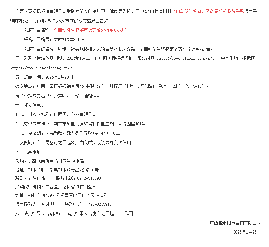 广西国泰招标咨询有限公司关于全自动微生物鉴定及药敏分析系统采购(GTBDB1C2025159)的成交结果公告