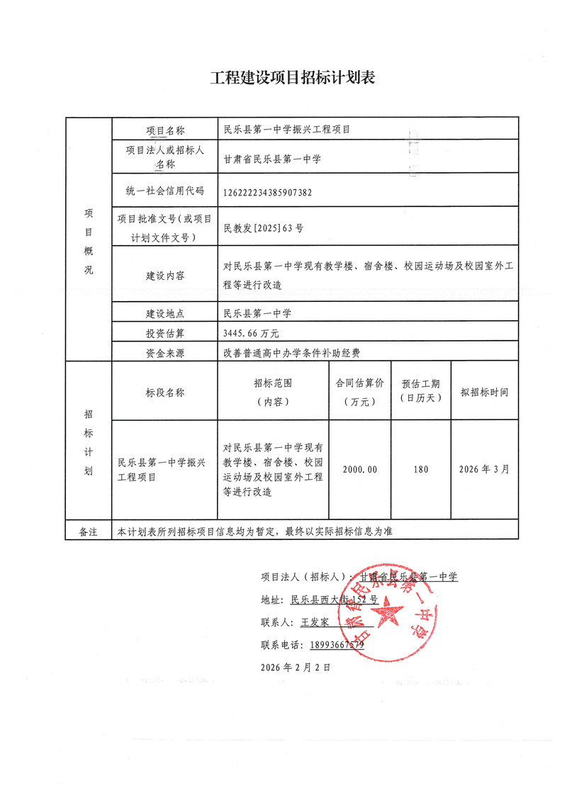 | 招标项目名称 | 民乐县第一中学振兴工程项目 | ||