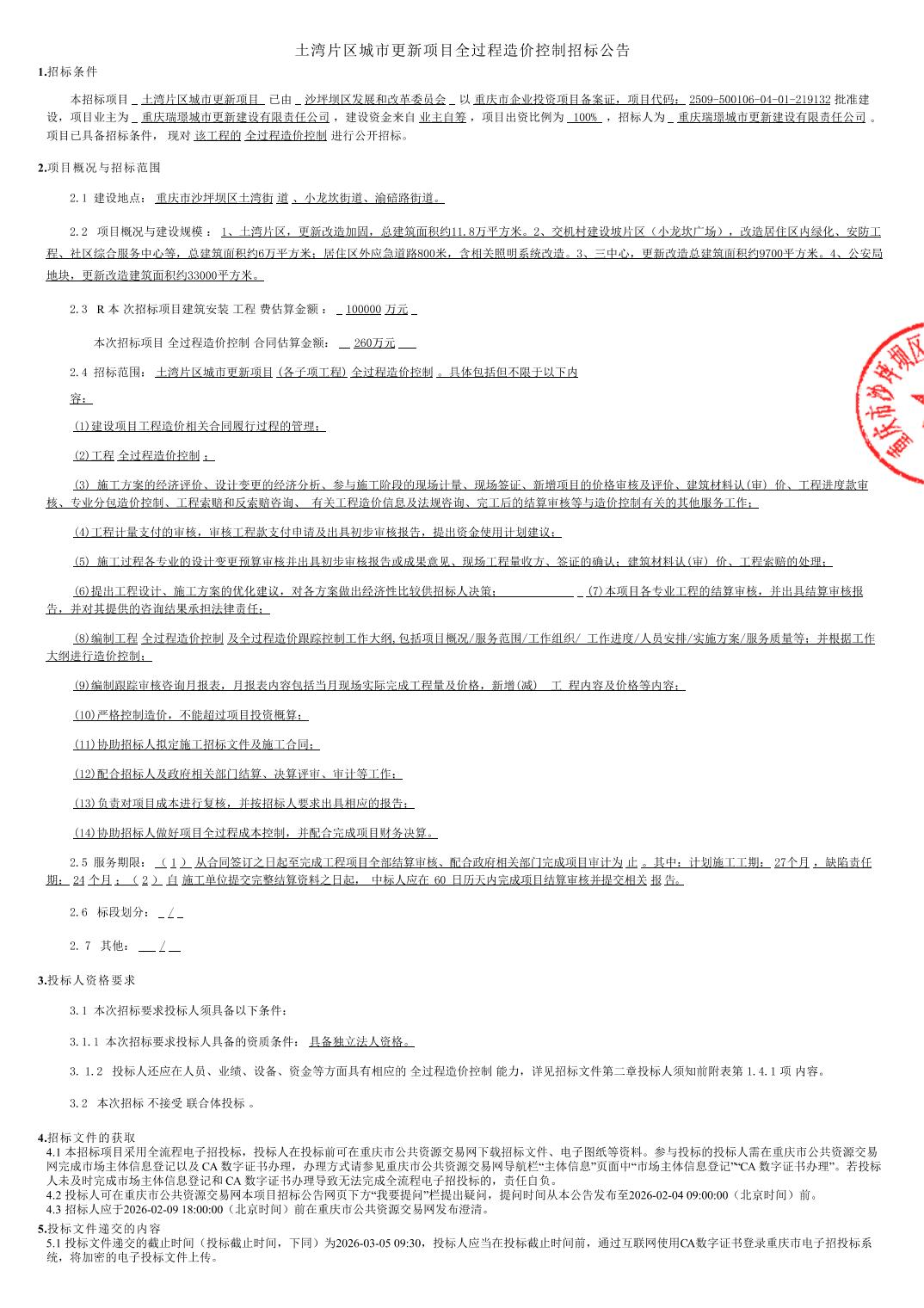 | 名称: | 土湾片区城市更新项目全过程造价控制招标公告 | ||||