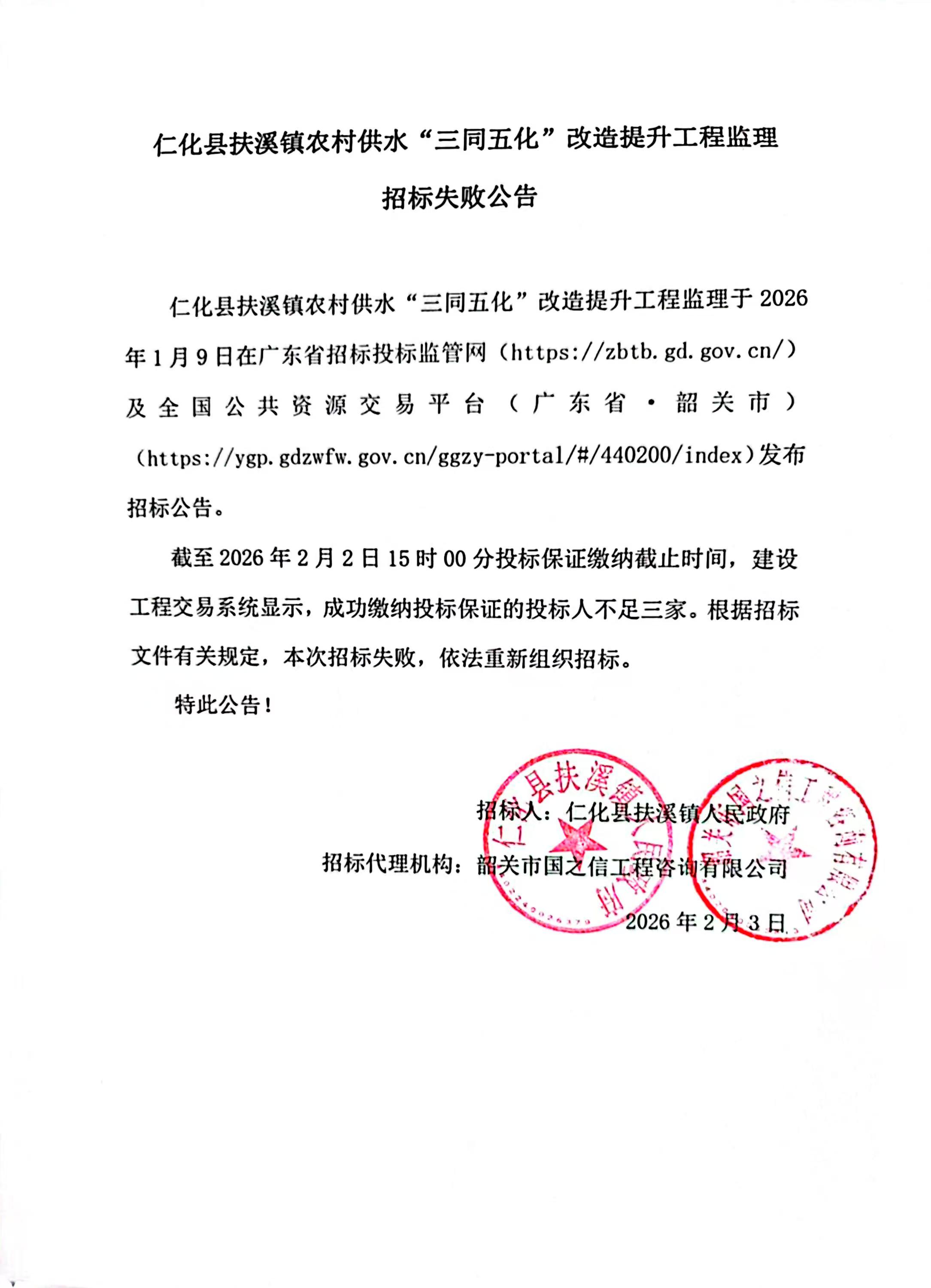 仁化县扶溪镇农村供水“三同五化”改造提升工程监理招标失败公告.***【点击下载】