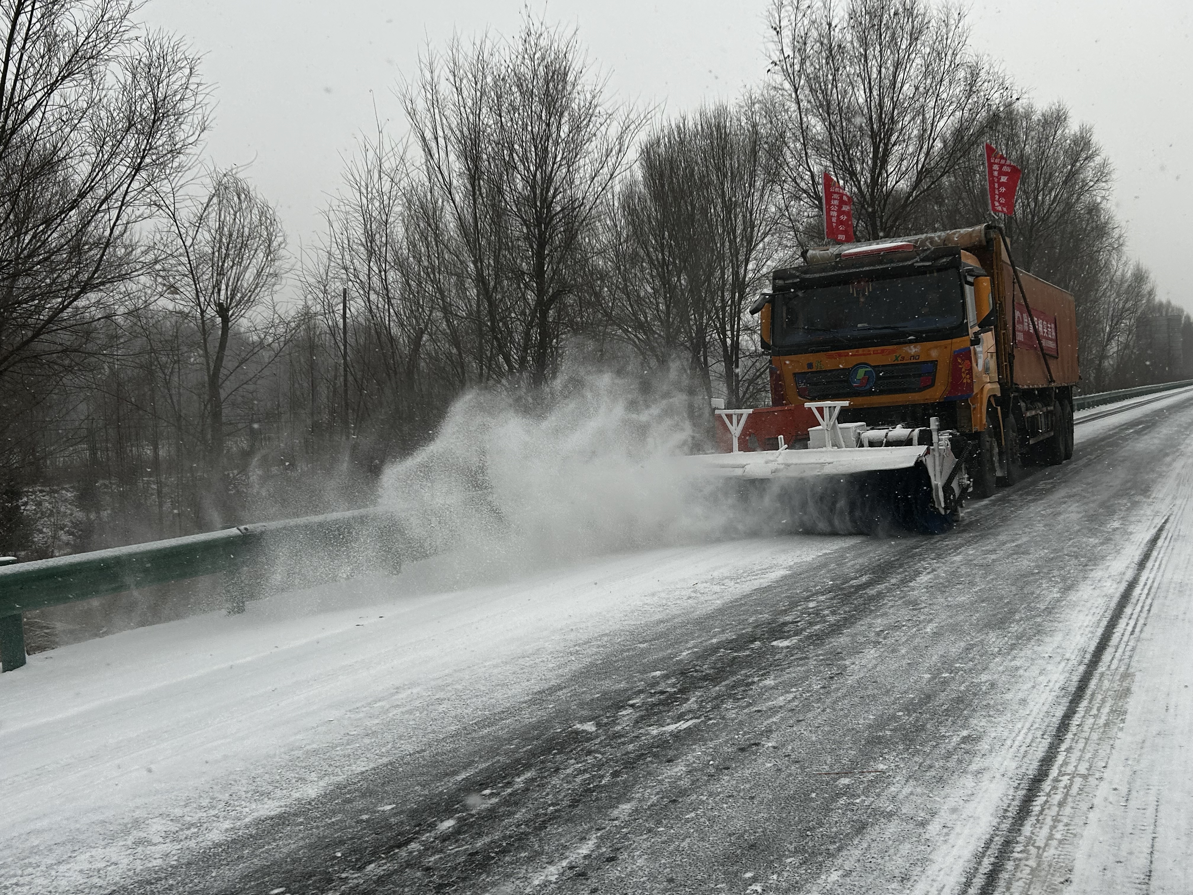 人机协同打响“清雪攻坚”。降雪伊始,临夏分公司立即启动应急响应,切换“人歇车不休”的全天候作战模式,在***双达高速卧龙沟路段、*****乌玛高速临夏至和政等重点路段,*个除雪小组组成*个作业梯队,按照“先主路后匝道、先桥梁后路面”的优先级开展循环除雪作业。滚刷车、铲板、撒布机协同联动,在积雪路段开辟出畅通通道。组织巡查车和作业梯队一起巡查作业,实时反馈路面积雪厚度,对桥梁伸缩缝、匝道转角等机械作业盲区,使用推雪板开展人工精补清理,确保除雪区域无死角、无残冰。作业队伍采用重点路段防滑料精准撒布的方式,减少融雪剂使用量,既保障除雪效果,又严守高原生态保护要求。