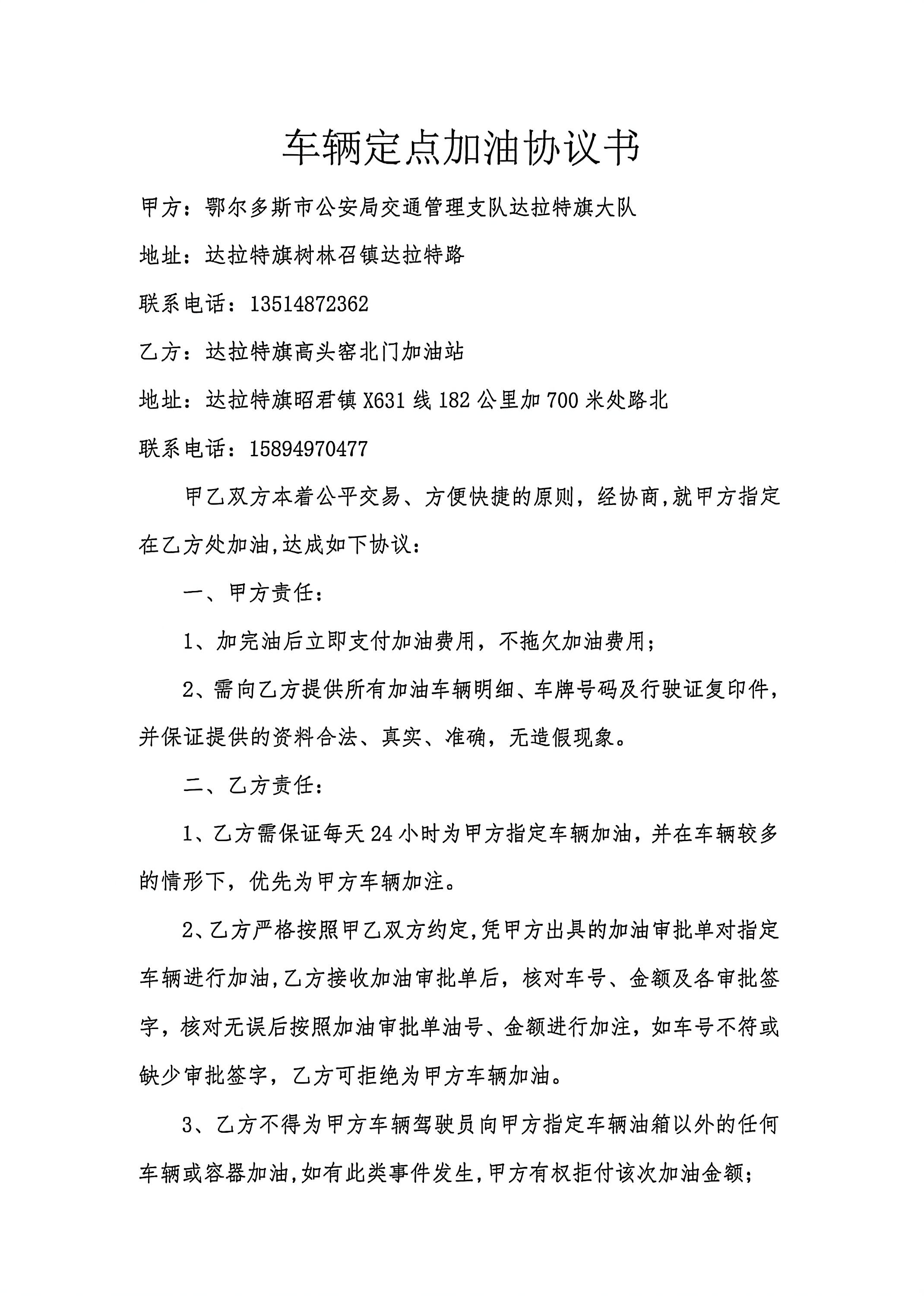 鄂尔多斯市公安局交通管理支队达拉特旗大队达旗大队高头窑北门加油站加油合同书政府采购合同公告