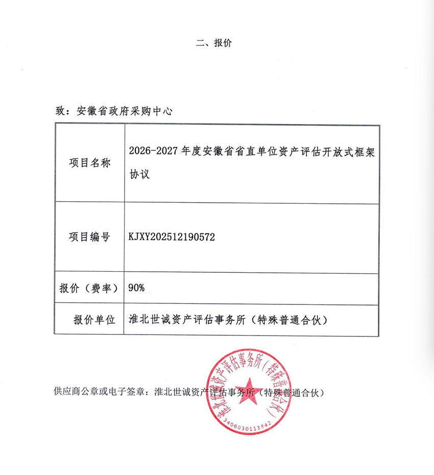 淮北世诚资产评估事务所(特殊普通合伙)入围2026-2027年度安徽省省直单位资产评估开放式框架协议的结果公告