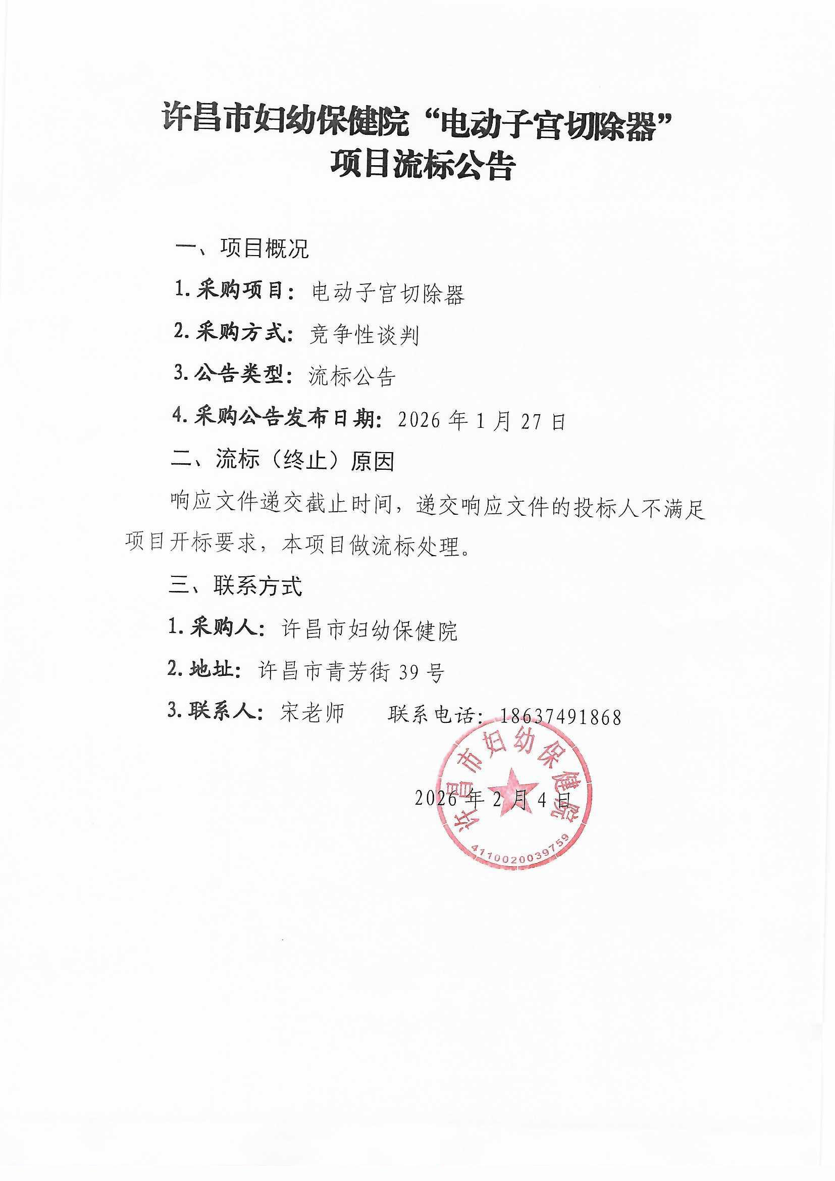 许昌市妇幼保健院“电动子宫切除器”项目流标公告