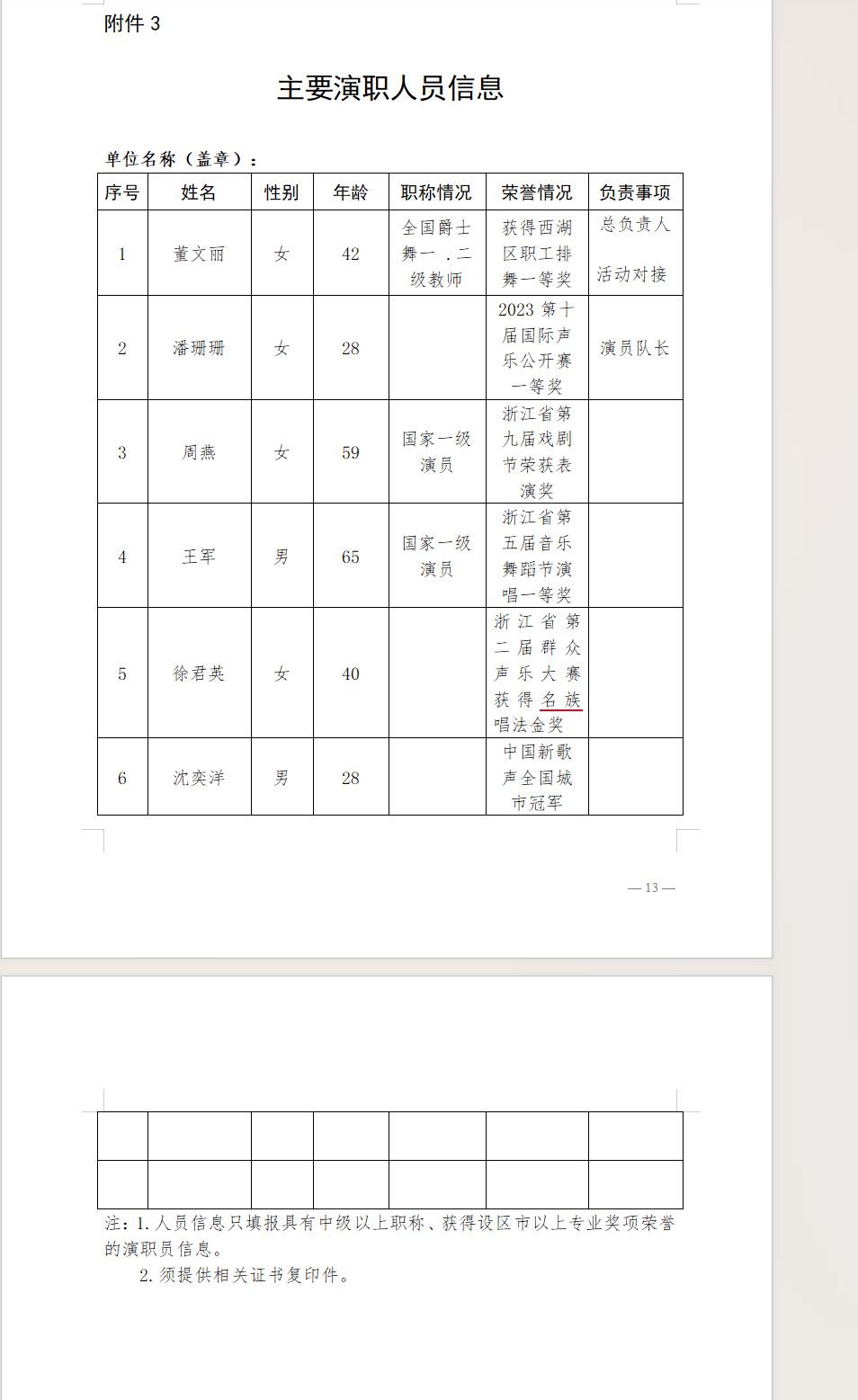 演职人员信息(按《公告》附件*格式填写):主要演职人员.***